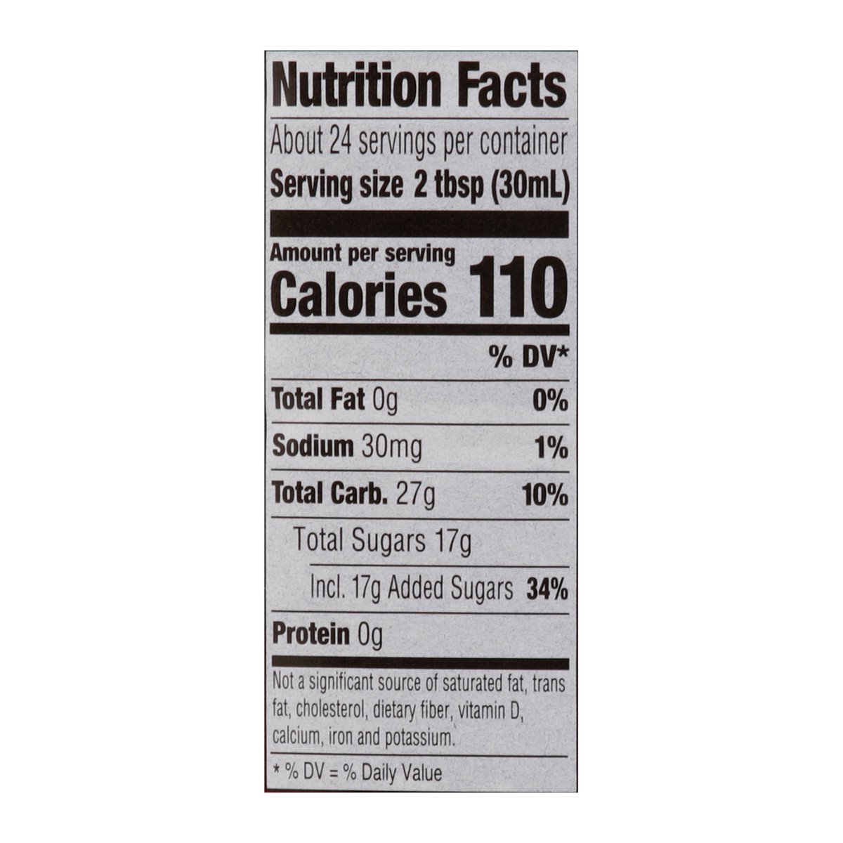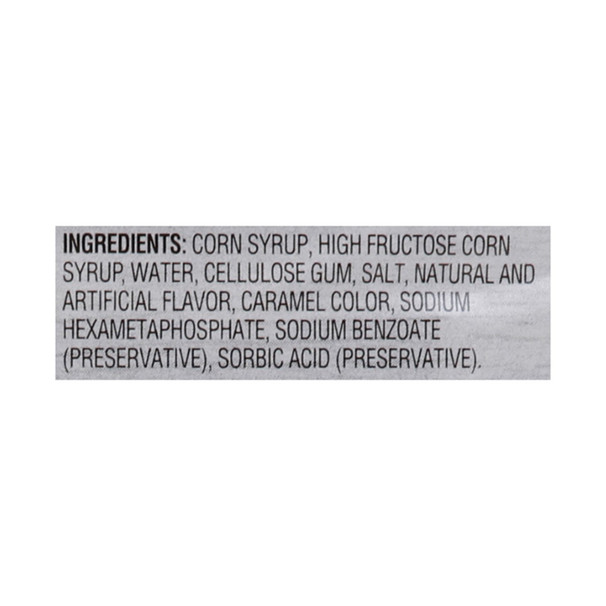 Corn Syrup, High Fructose Corn Syrup, Water, Cellulose Gum, Salt, Natural and Artificial Flavor, Caramel Color, Sodium Hexametaphosphate, Sodium Benzoate (Preservative), Sorbic Acid (Preservative).