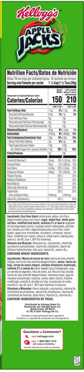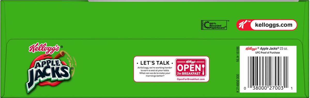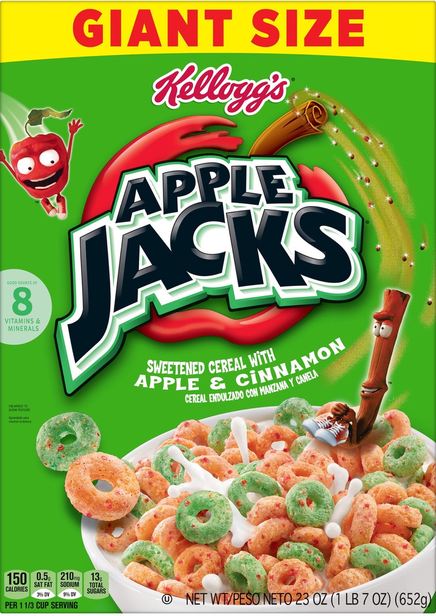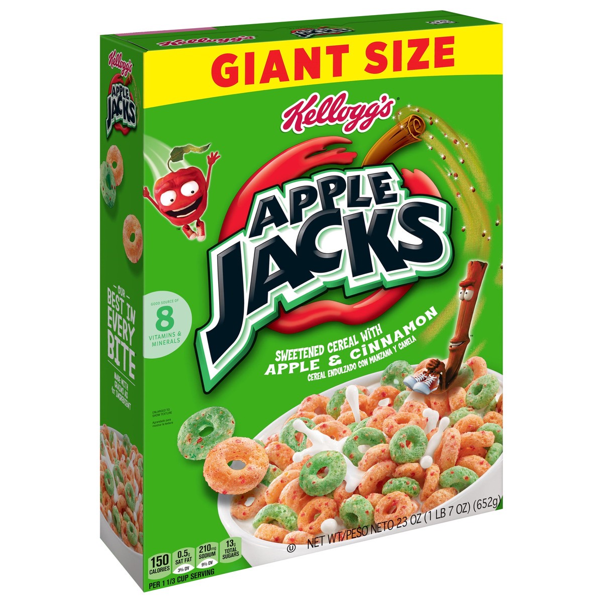- 23oz giant-size box of Kellogg's Apple Jacks Original ready-to-eat cereal; Packaged for freshness and great taste