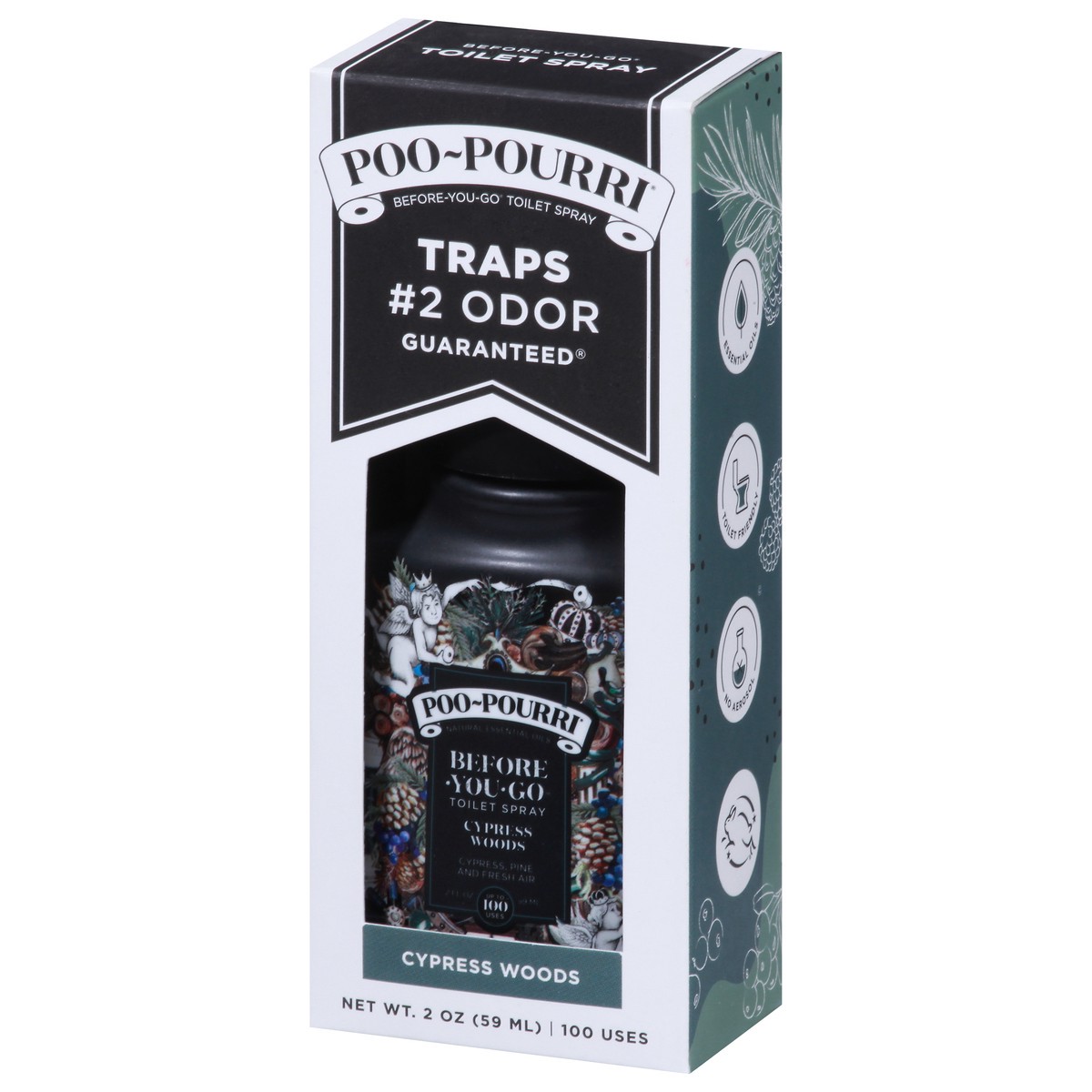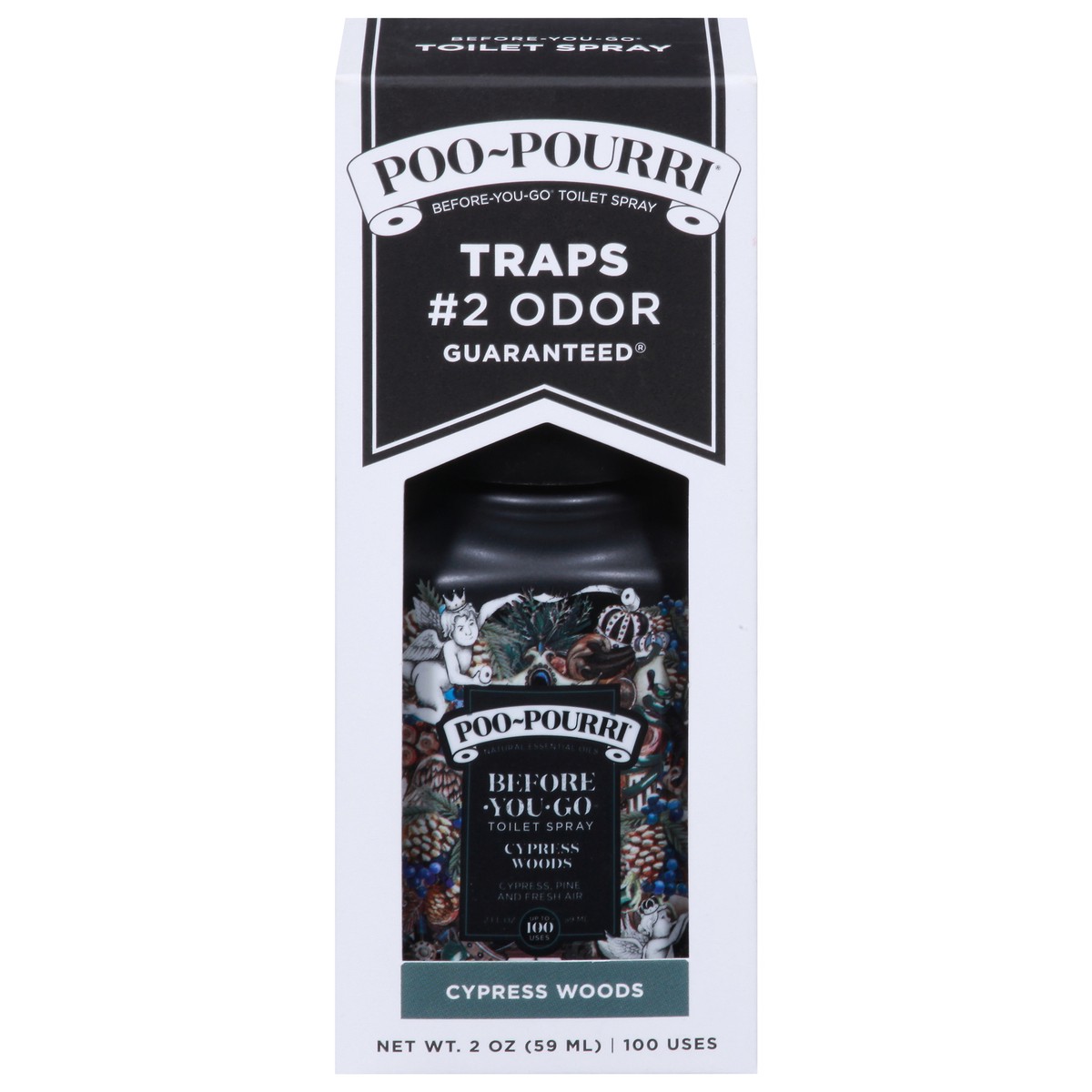 Before-you-go toilet spray. Traps no 2 odor guaranteed. 100 uses. up to 100 uses. Pouring is only natural. So is poo-pourri. Poo-pourri Cypress Woods is made with 100% natural essential oils that elim…