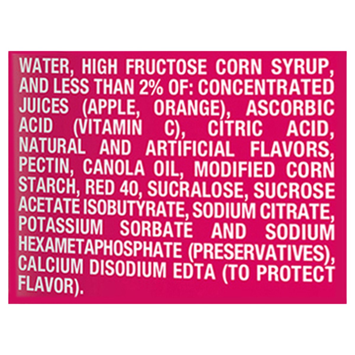 Water, High Fructose Corn Syrup, and Less than 2% of: Concentrated Juices (Apple, Orange), Ascorbic Acid (Vitamin C), Citric Acid, Natural and Artificial Flavors, Pectin, Canola Oil, Modified Corn Sta…