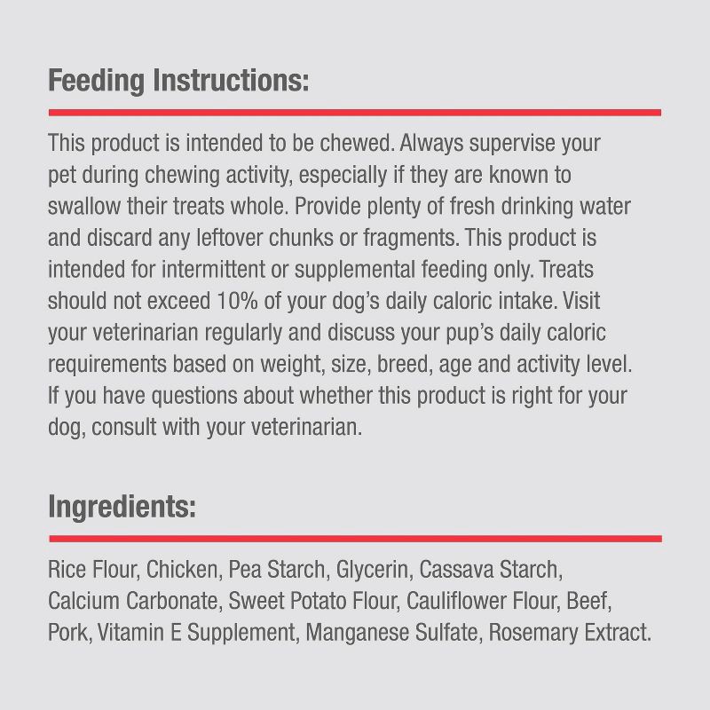 Rice Flour, Chicken, Pea Starch, Glycerin, Cassava Starch, Calcium Carbonate, Sweet Potato Flour, Cauliflower Flour, Pork, Beef, Vitamin E Supplement, Manganese Sulfate, Rosemary Extract.