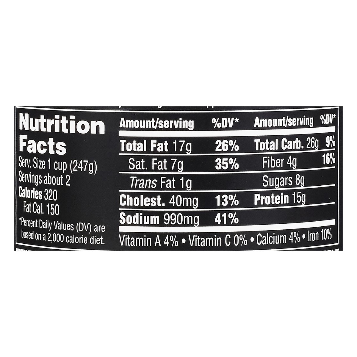 Ingredients: Beef Broth, Beef, Kidney Beans, Tomatoes (Water, Tomato Paste), Water, Pork, Contains 2% or less of Dehydrated Onions, Cornstarch, Sugar, Salt, Spices, Jalapeño Peppers, Dehydrated Bell P…