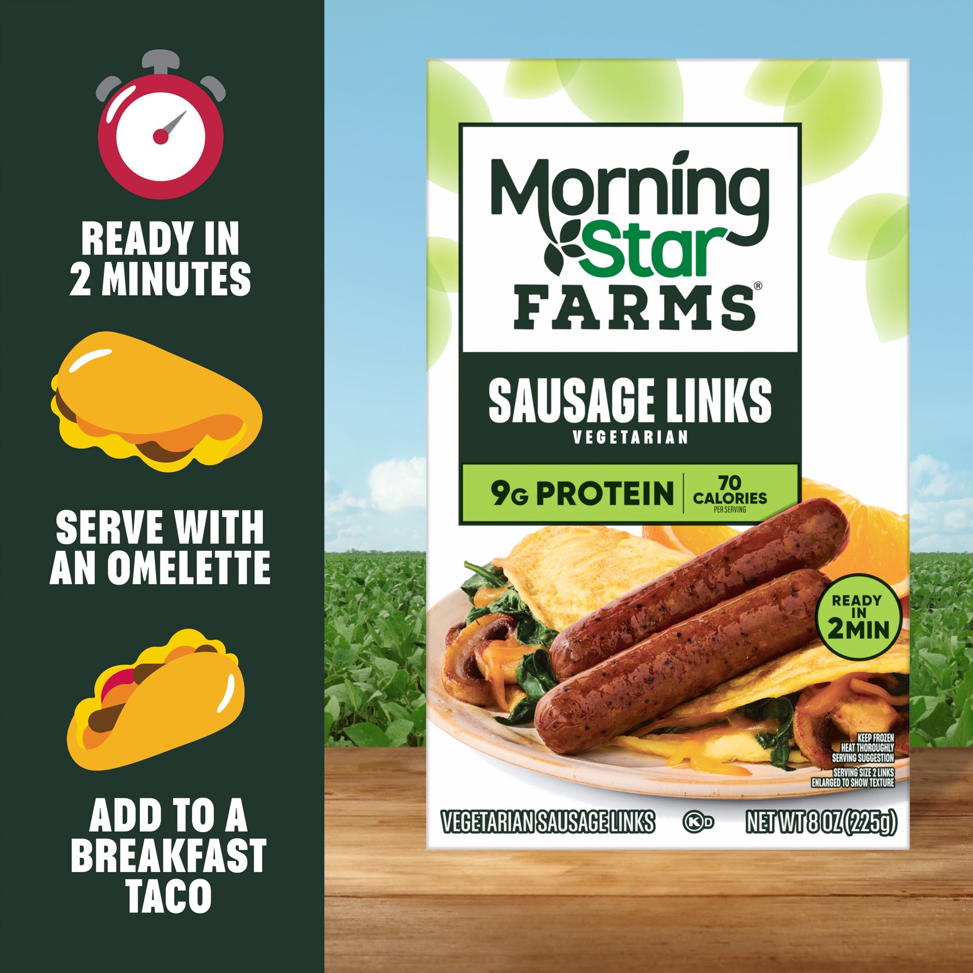 MorningStar Farms veggie sausage links are a vegetarian meat alternative seasoned with an inviting blend of aromatic spices to delight everyone in your family. With 85% less fat than cooked pork sausa…