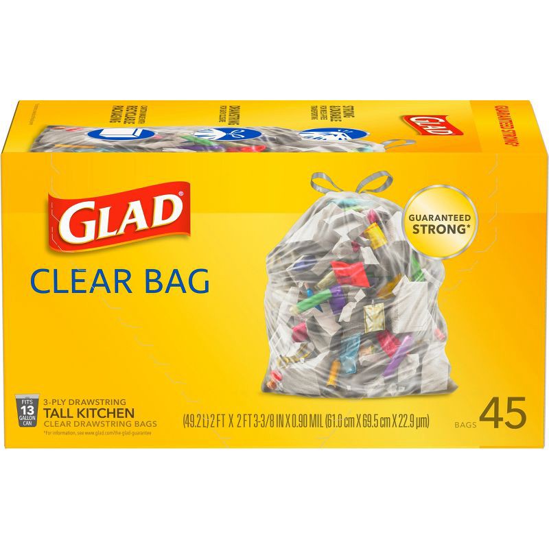 For bag based recycling programs, Glad Tall Kitchen Drawstring Clear Bags are designed for use in municipalities that permit or require recyclables to be placed in translucent bags for pickup. Many re…