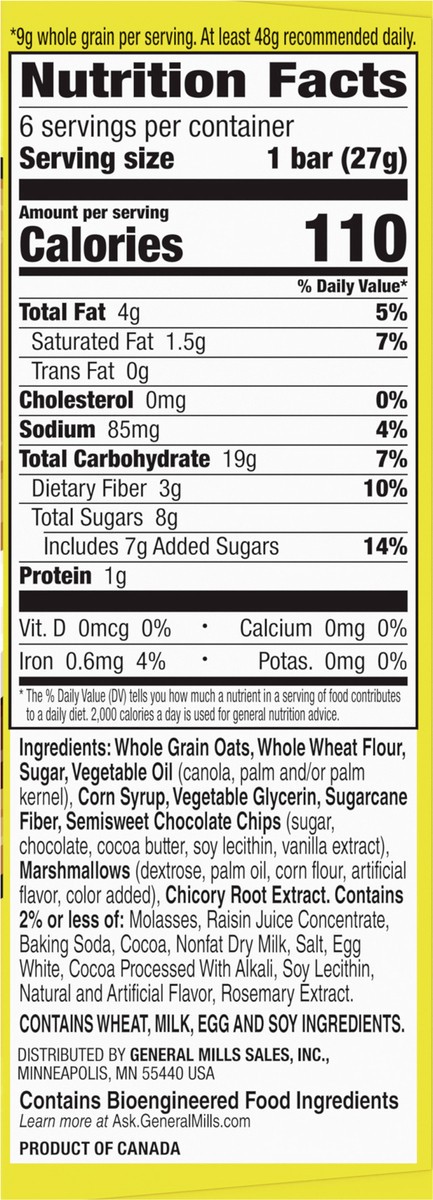 Whole Grain Oats, Whole Wheat Flour, Sugar, Vegetable Oil (Canola, Palm and/or Palm Kernel), Corn Syrup, Vegetable Glycerin, Sugarcane Fiber, Semisweet Chocolate Chips (Sugar, Chocolate, Cocoa Butter,…