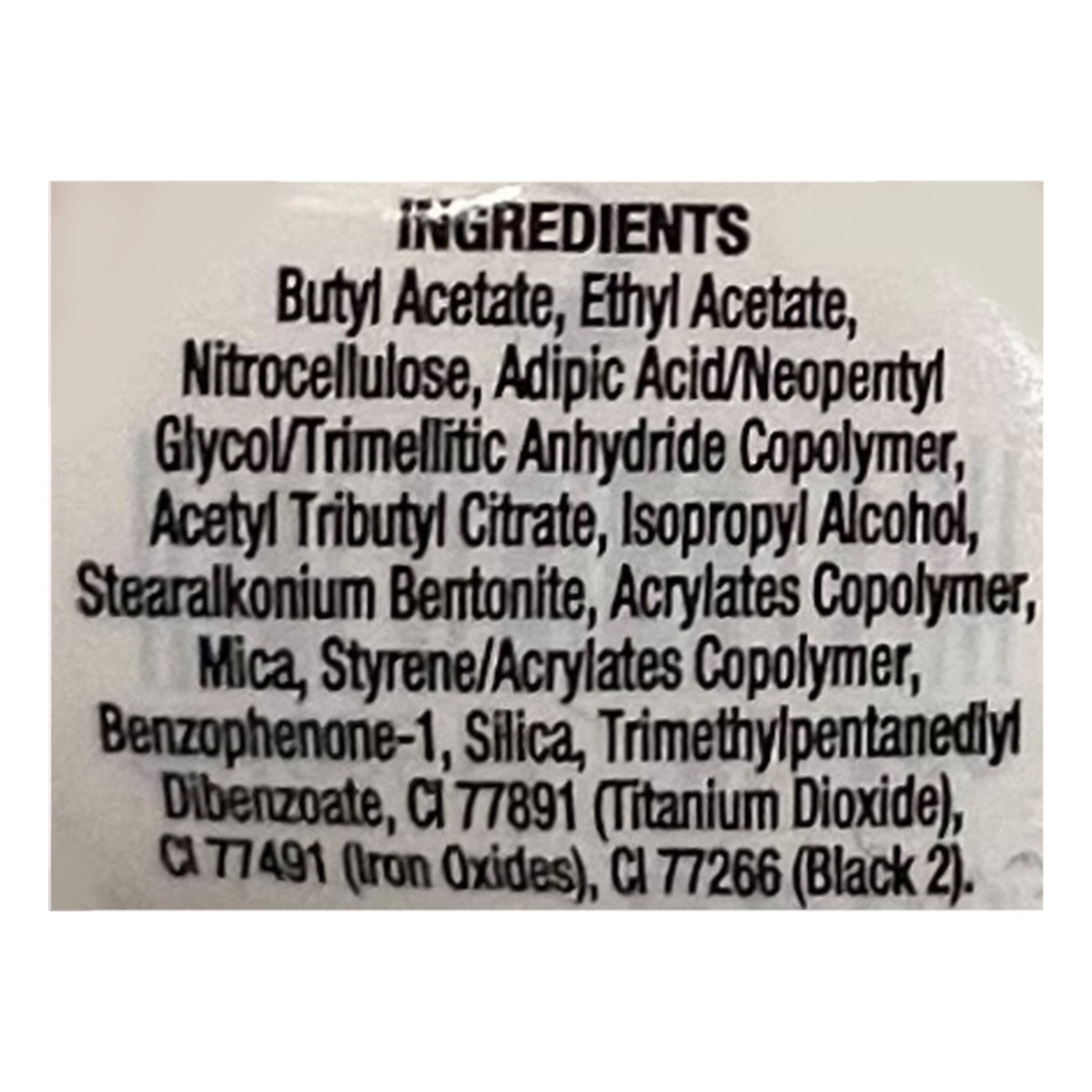 Butyl Acetate, Ethyl Acetate, Nitrocellulose, Adipic Acid/Neopentyl Glycol/Trimellitic Anhydride Copolymer, Acetyl Tributyl Citrate, Isopropyl Alcohol, Stearalkonium Bentonite, Acrylates Copolymer, Mi…