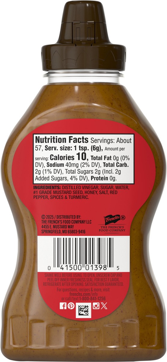 French’s Hot Honey Mustard is the perfect balance of the honey mustard flavor you love, with a spicy kick! Made with #1 grade mustard seed, the sweetness of honey, and a kick of red pepper, this irres…