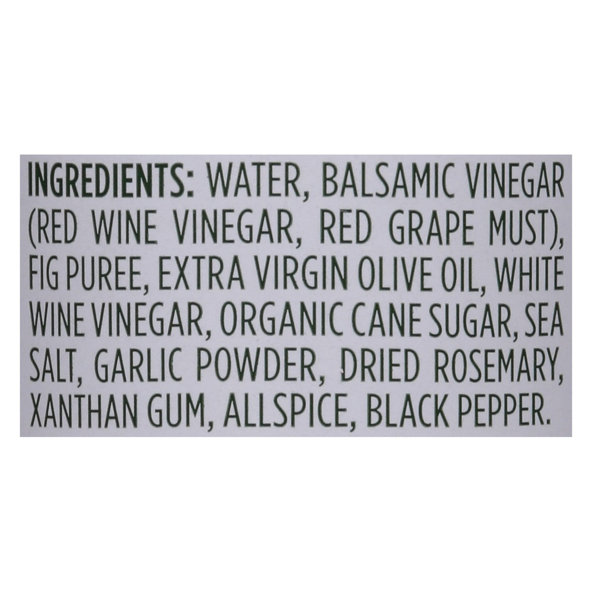Water\, Balsamic Vinegar (Red Wine Vinegar\, Red Grape Must)\, Fig Puree\, Extra Virgin Olive Oil\, White Wine Vinegar\, Organic Cane Sugar\, Sea Salt\, Garlic Powder\, Dried Rosemary\, Xanthan Gum\, …