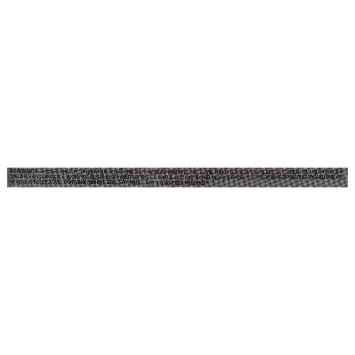 Enriched Wheat Flour (Ferrous Sulfate, Niacin, Thiamine Mononitrate, Riboflavin, Folic Acid) Sugar, Whole Eggs, Soybean Oil, Cocoa Powder Cinnamon, Whey, Corn Starch, Baking Powder, Baking Soda, Wheat…