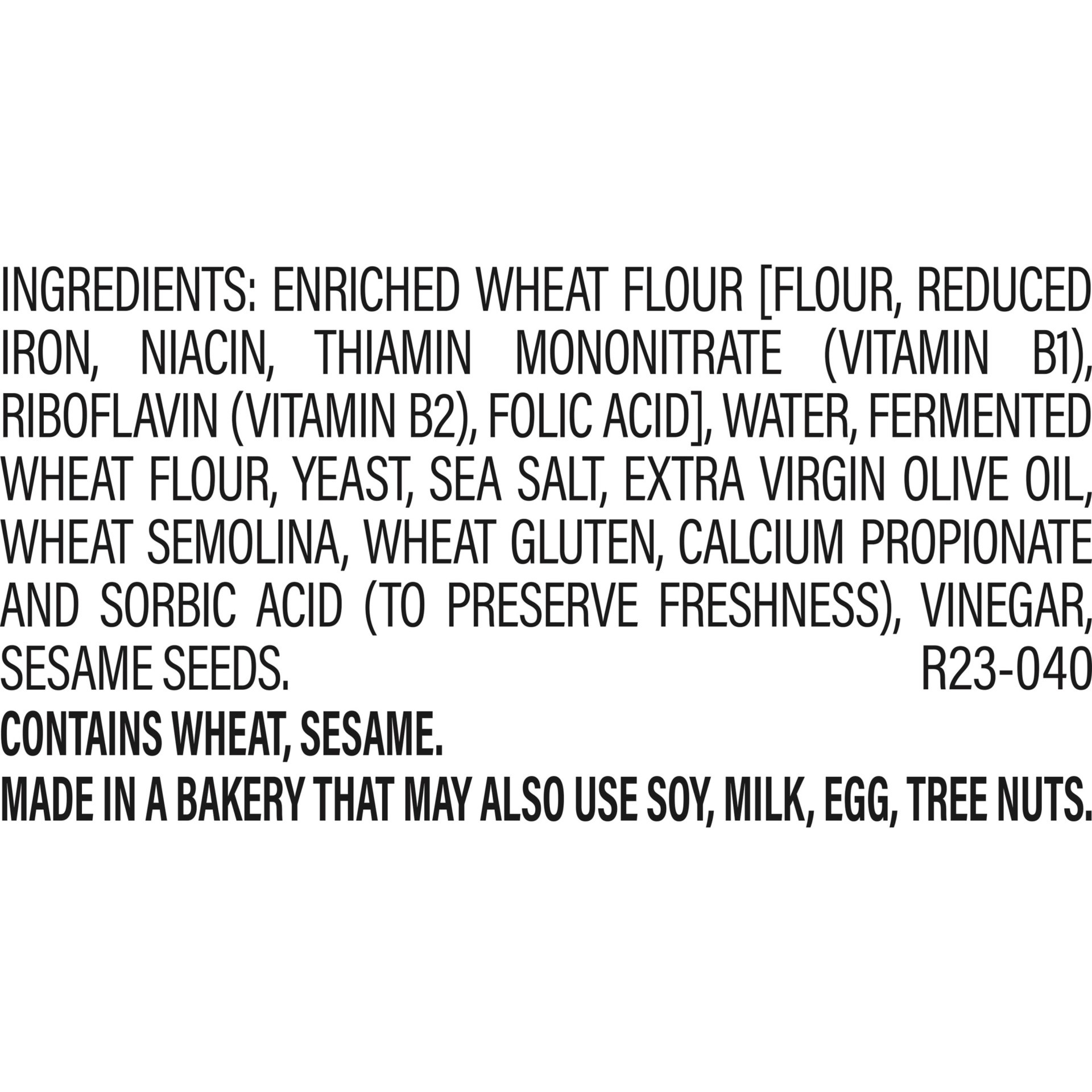 Enriched Wheat Flour [Flour, Reduced Iron, Niacin, Thiamin Mononitrate (Vitamin B1), Riboflavin (Vitamin B2), Folic Acid], Water, Fermented Wheat Flour, Yeast, Sea Salt, Extra Virgin Olive Oil, Wheat …