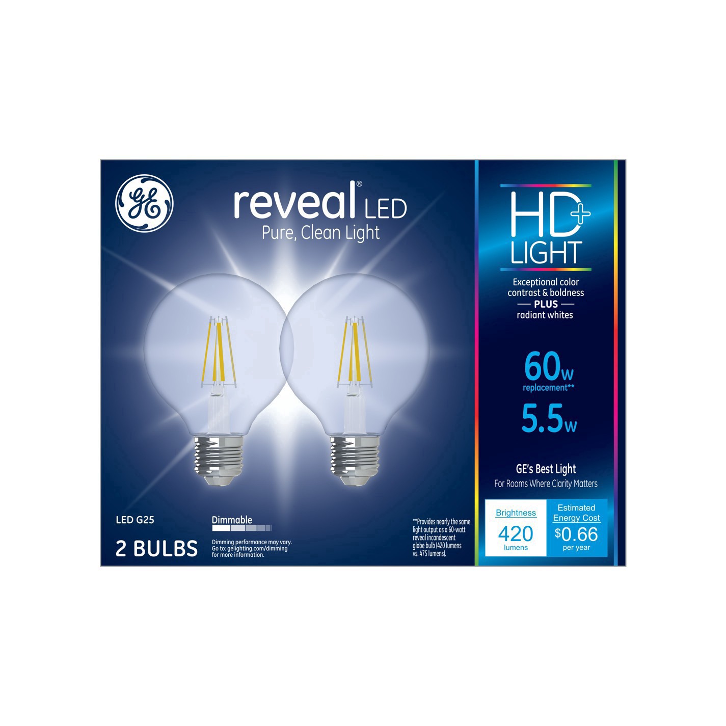 GE Household Lighting 2pk 5W 60W Equivalent Reveal LED HD+ Globe Light Bulbs Clear
