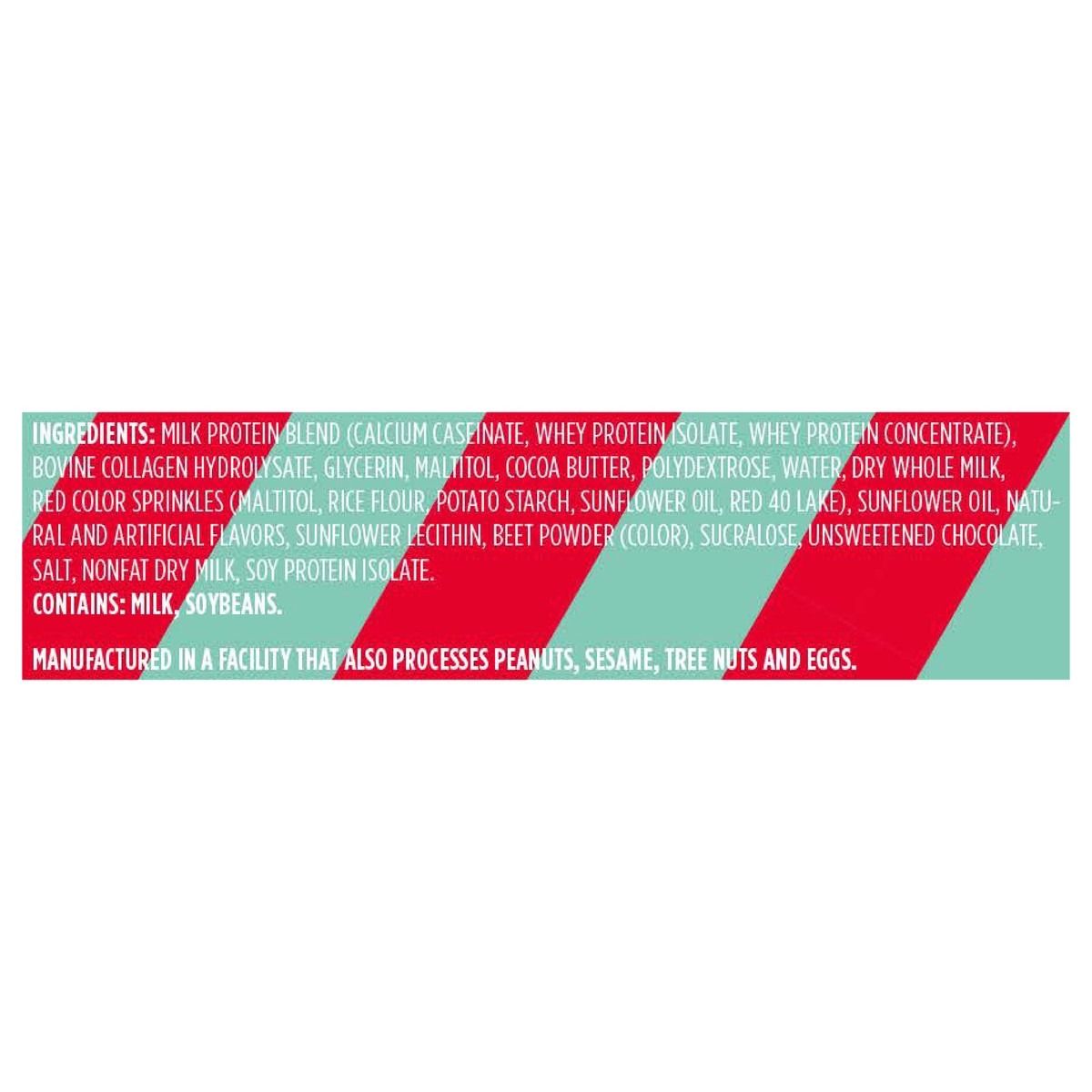 Milk Protein Blend (Calcium Caseinate, Whey Protein Isolate, Whey Protein Concentrate), Bovine Collagen Hydrolysate, Glycerin, Maltitol, Cocoa Butter, Polydextrose, Water, Dry Whole Milk, Red Color Sp…