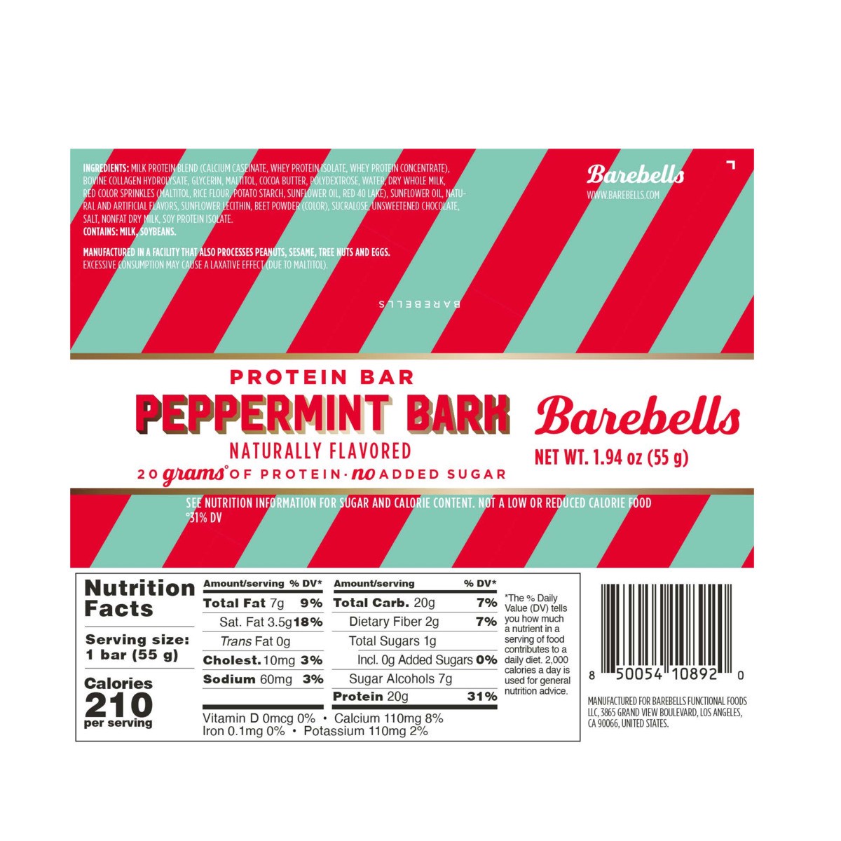 Barebells Peppermint Bark Protein Bar has a smooth, peppermint candy-flavored filling, a silky and sweet white chocolate coat, and crispy sprinkles.
