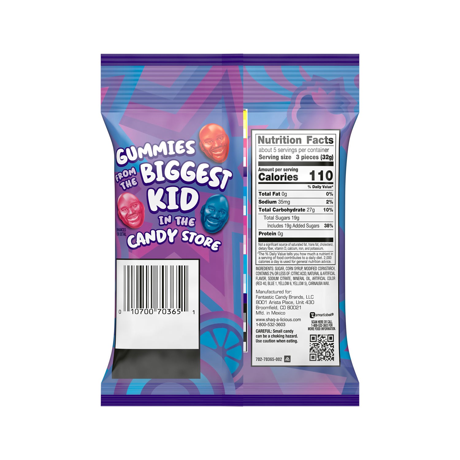 Shaq-A-Licious Gummies Peg Bag Peach Orange & Berry Punch Flavors - Ea