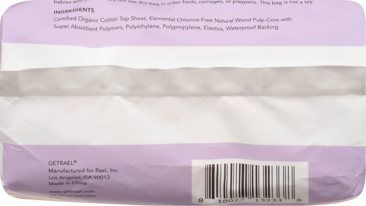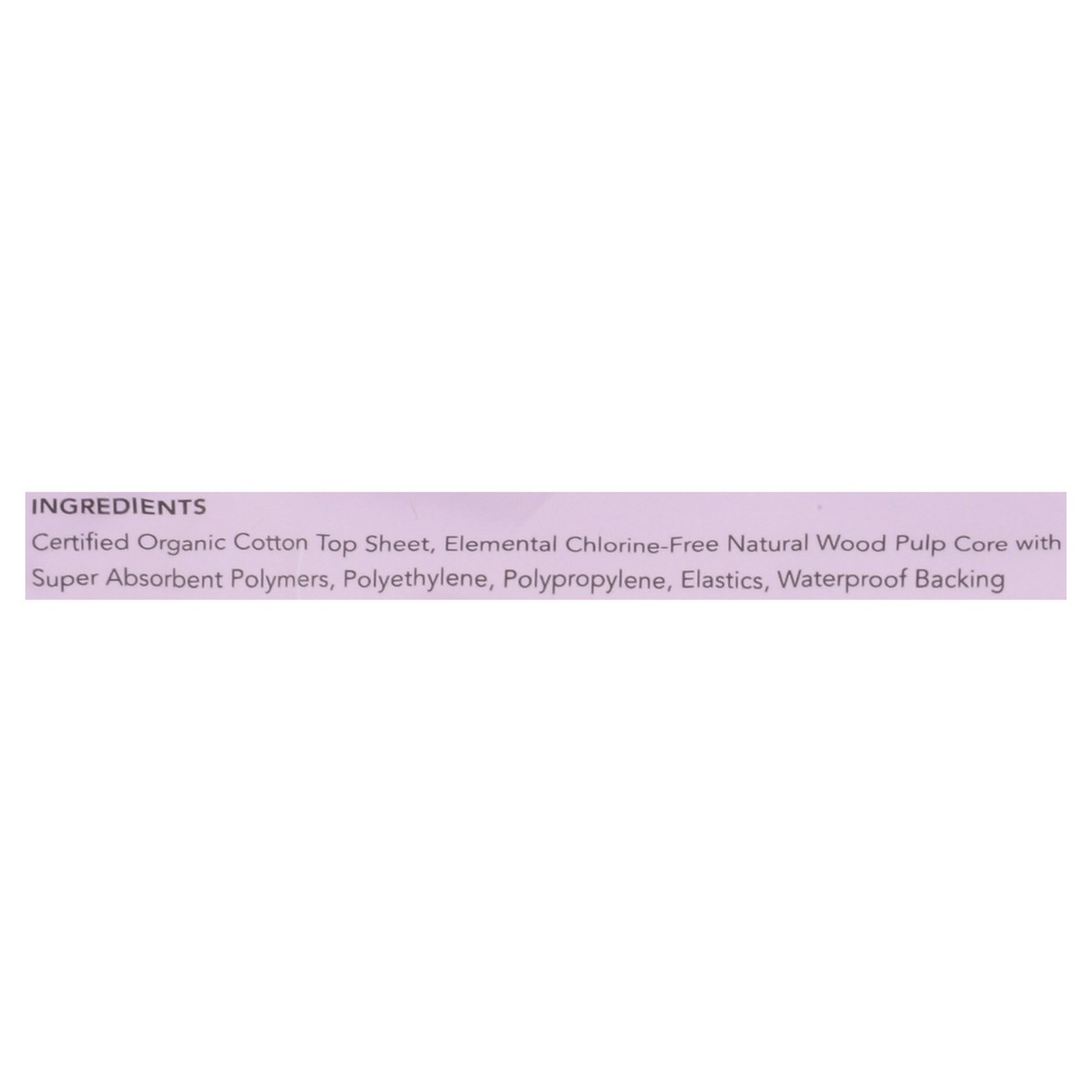 Certified Organic Cotton Top Sheet, Elemental Chlorine-Free Natural Wood Pulp Core with Super Absorbent Polymers, Polyethylene, Polypropylene, Elastics, Waterproof Backing