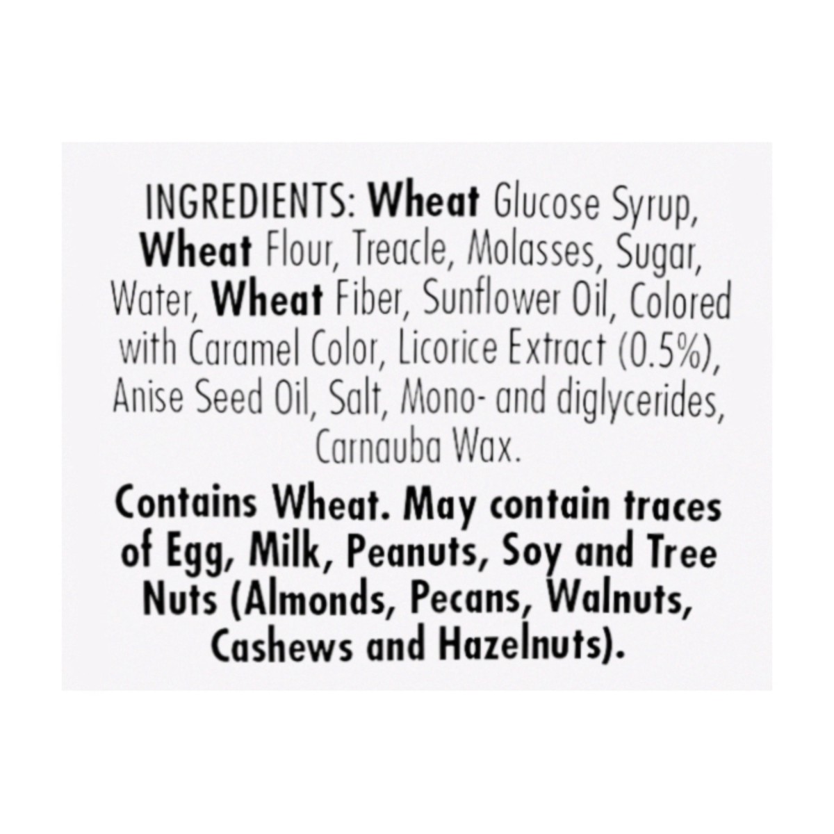 Wheat Glucose Syrup, Wheat Flour, Treacle, Molasses, Sugar, Water, Wheat Fiber, Sunflower Oil, Colored with Caramel Color, Licorice Extract (0.5%), Anise Seed Oil, Salt, Mono- and Diglycerides, Carnau…