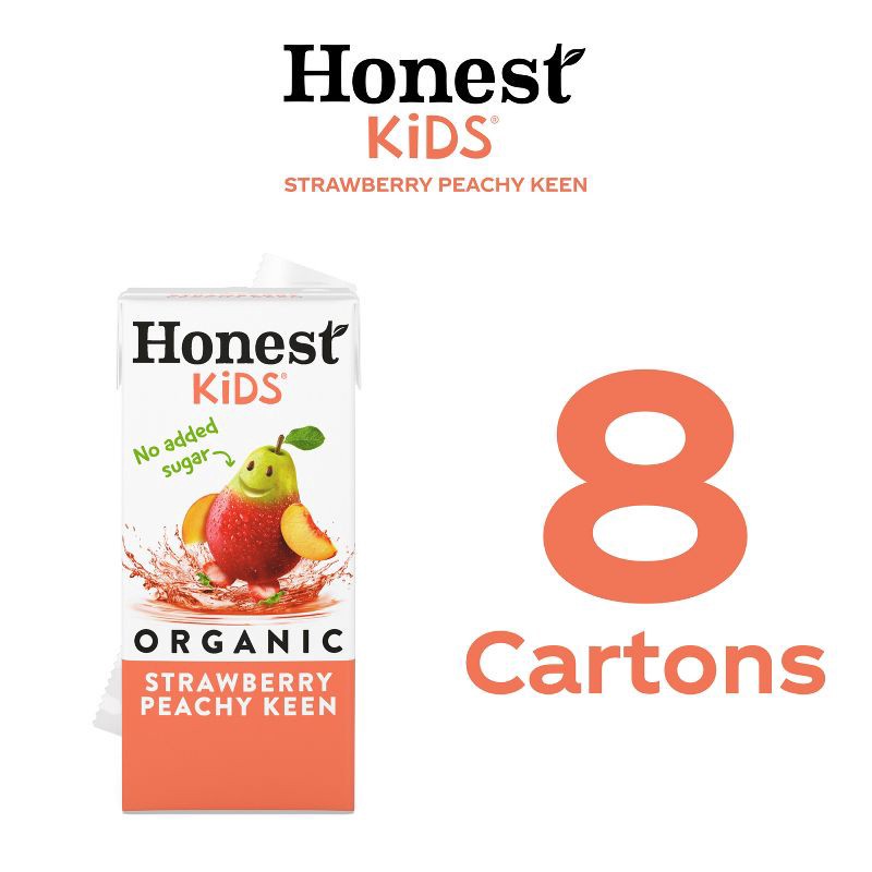 - 8 pack, 6 fl oz cartons of Honest Kids Strawberry Peachy Keen Organic juice drink
