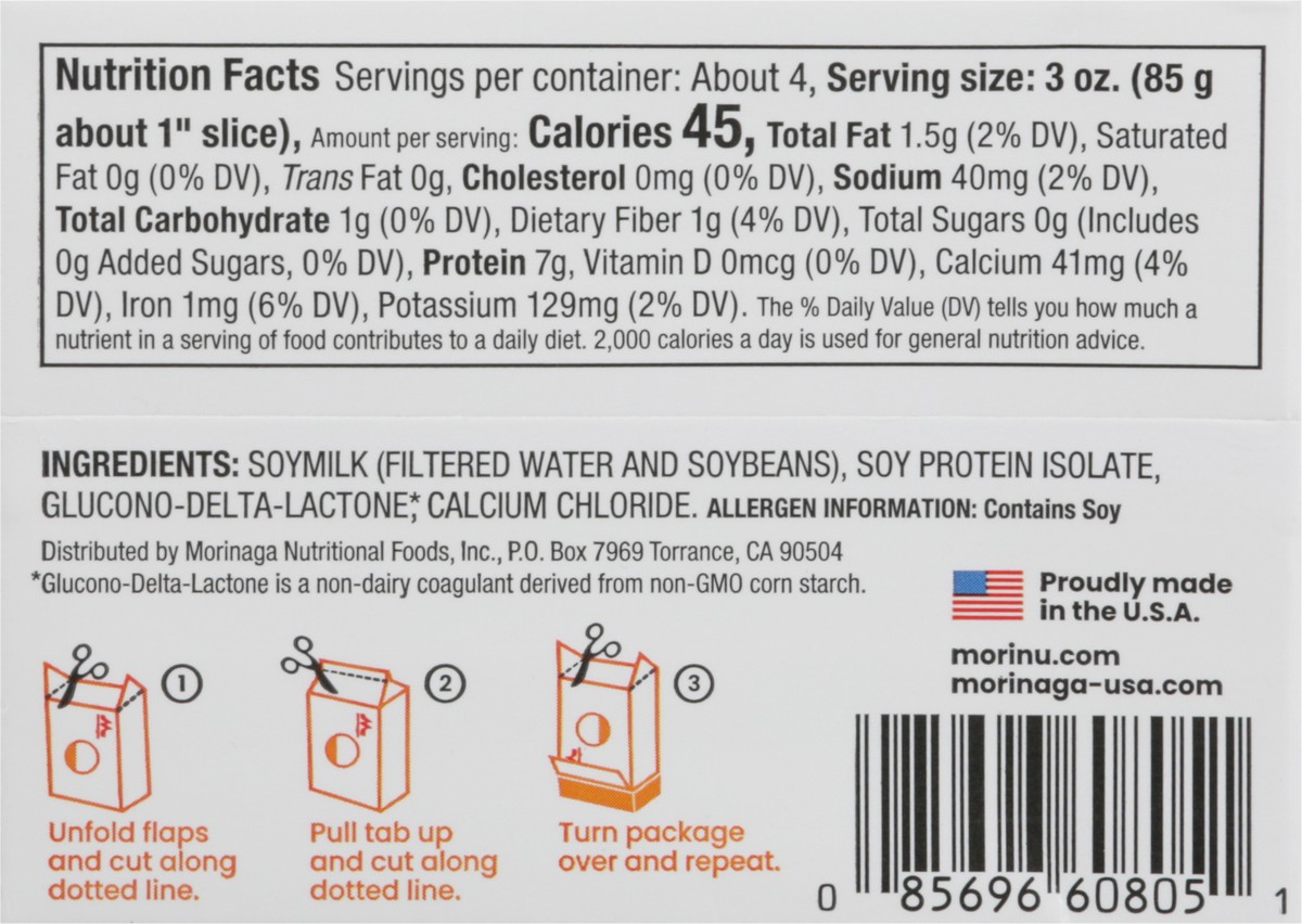 Soymilk (Filtered Water and Soybeans), Soy Protein Isolate, Glucono-Delta-Lactone (Glucono-Delta-Lactone is a Non-Dairy Coagulant Derived From Non-GMO Corn Starch), Calcium Chloride.