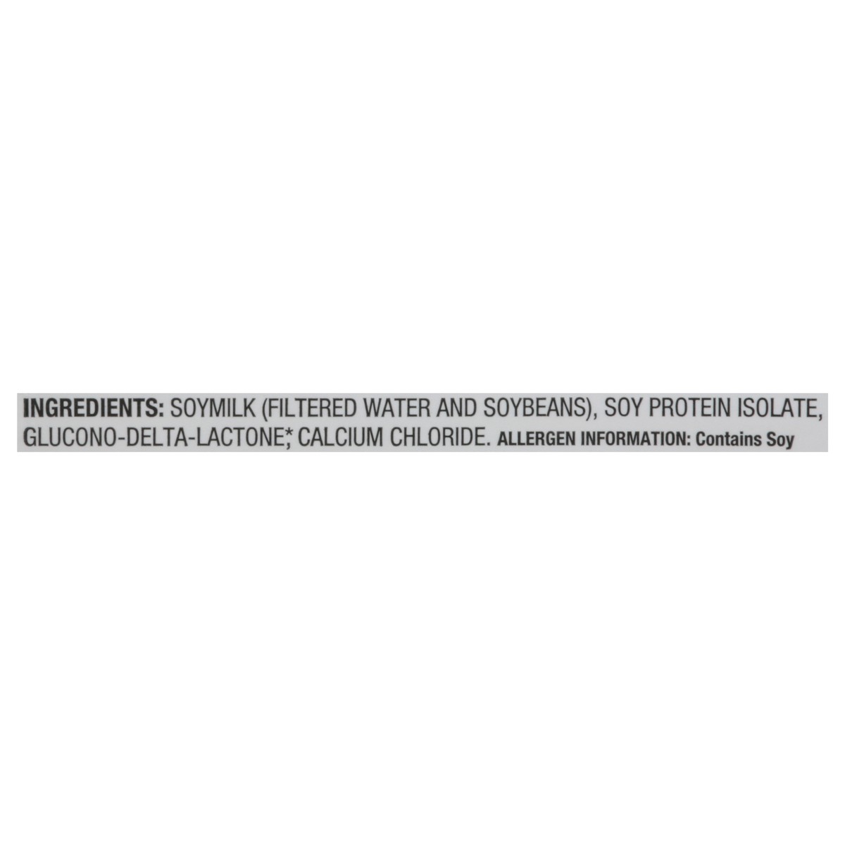 Soymilk (Filtered Water and Soybeans), Soy Protein Isolate, Glucono-Delta-Lactone (Glucono-Delta-Lactone is a Non-Dairy Coagulant Derived From Non-GMO Corn Starch), Calcium Chloride.