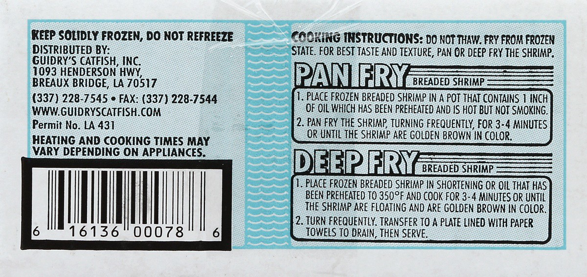 Ready to cook. Wild American shrimp. 100% American. www.louisianaselectfoods.com. www.guidrycatfish.com. Corrugated recycles. Product of Louisiana, USA.