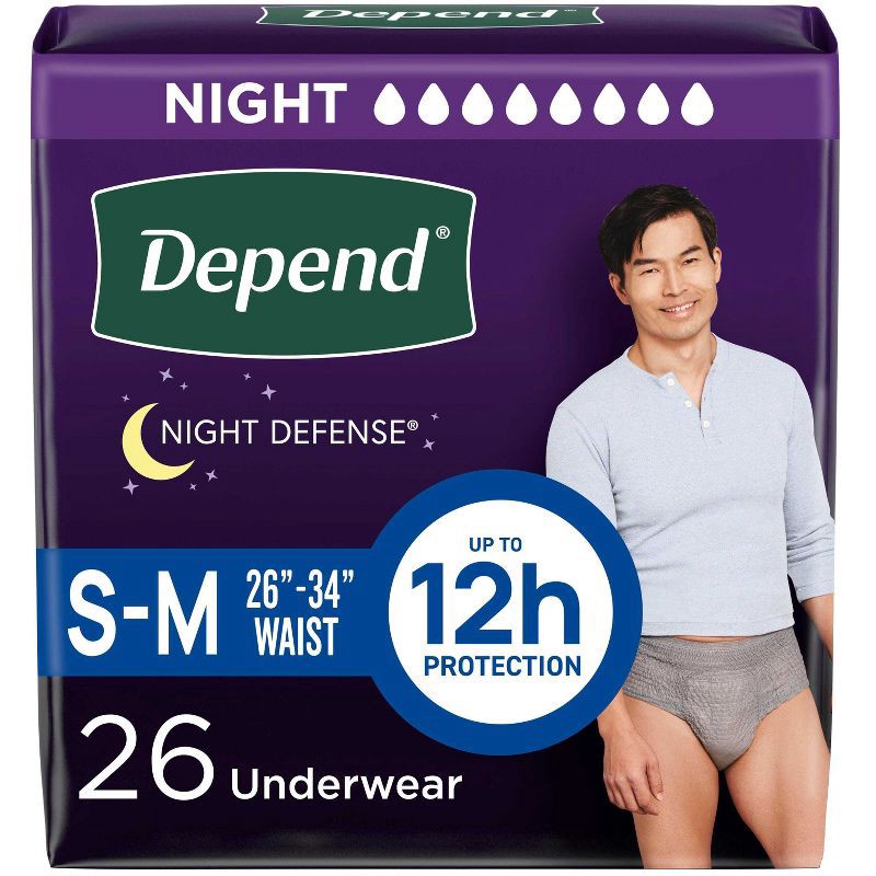 - DEPEND NIGHT DEFENSE: 26 count of Depend Night Defense Adult Incontinence Underwear for Men, size small/medium (26–34" waist)