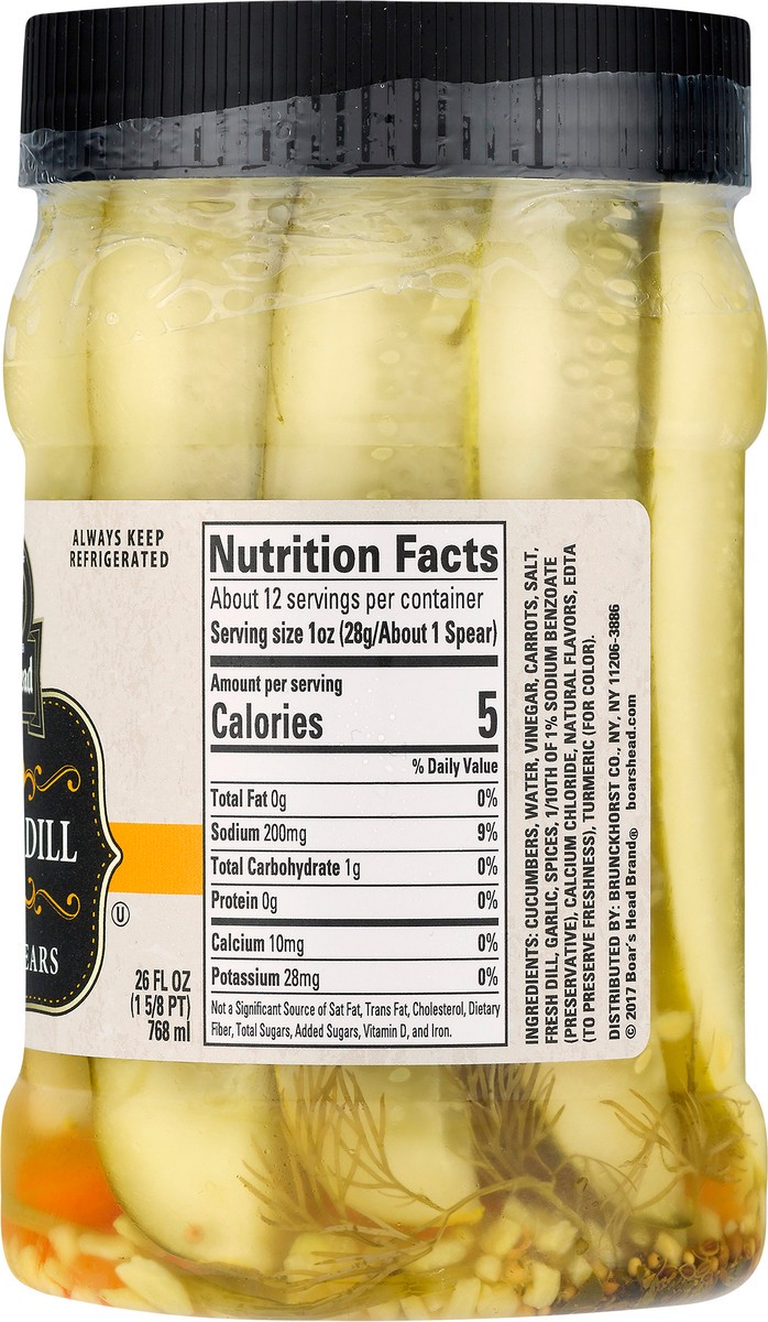 Cucumbers, Water, Vinegar, Carrots, Salt, Fresh Dill, Garlic, Spices, 1/10th of 1% Sodium Benzoate (Preservative), Calcium Chloride, Natural Flavors, EDTA (to Preserve Freshness), Turmeric (for Color)…
