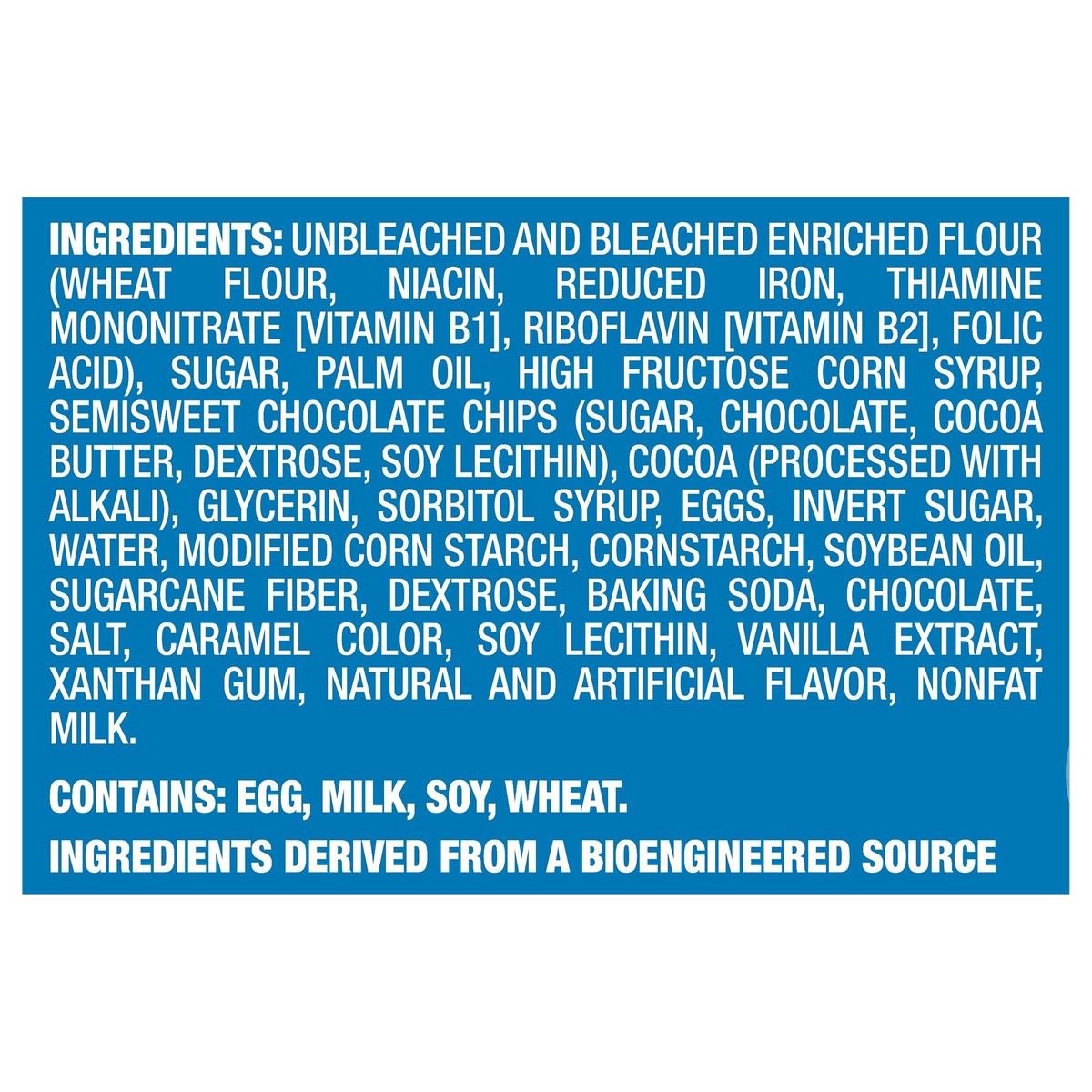 Unbleached and Bleached Enriched Flour (Wheat Flour, Niacin, Reduced Iron, Thiamine Mononitrate [Vitamin B1], Riboflavin [Vitamin B2], Folic Acid), Sugar, Palm Oil, High Fructose Corn Syrup, Semisweet…