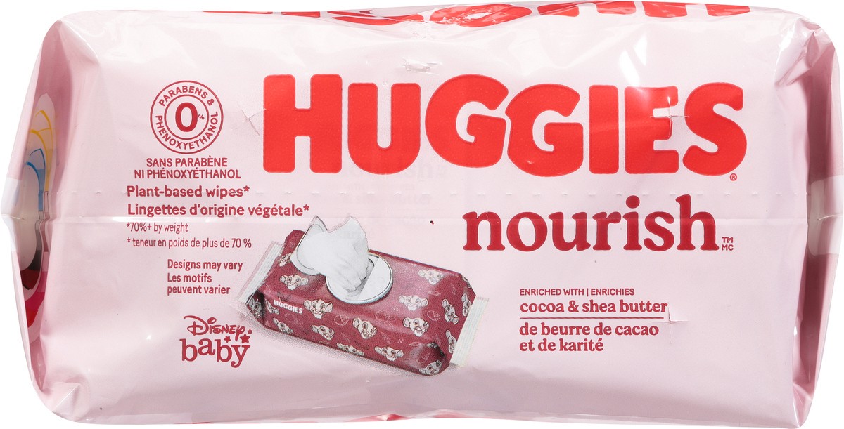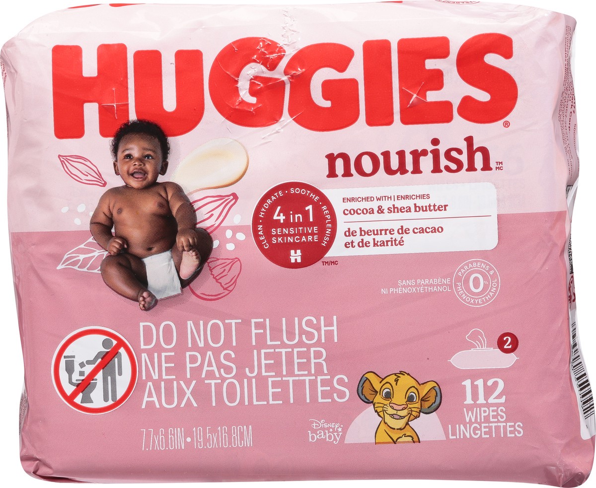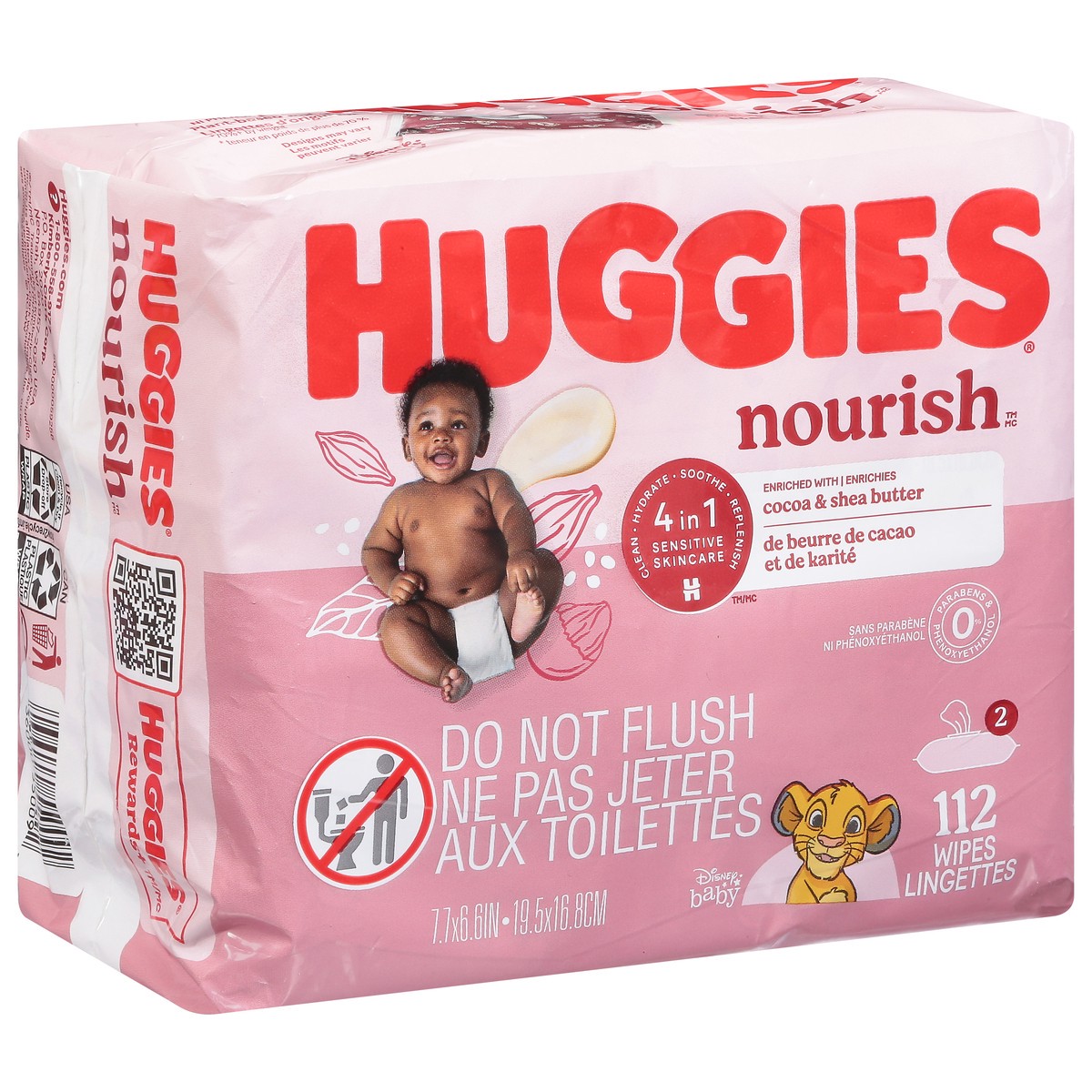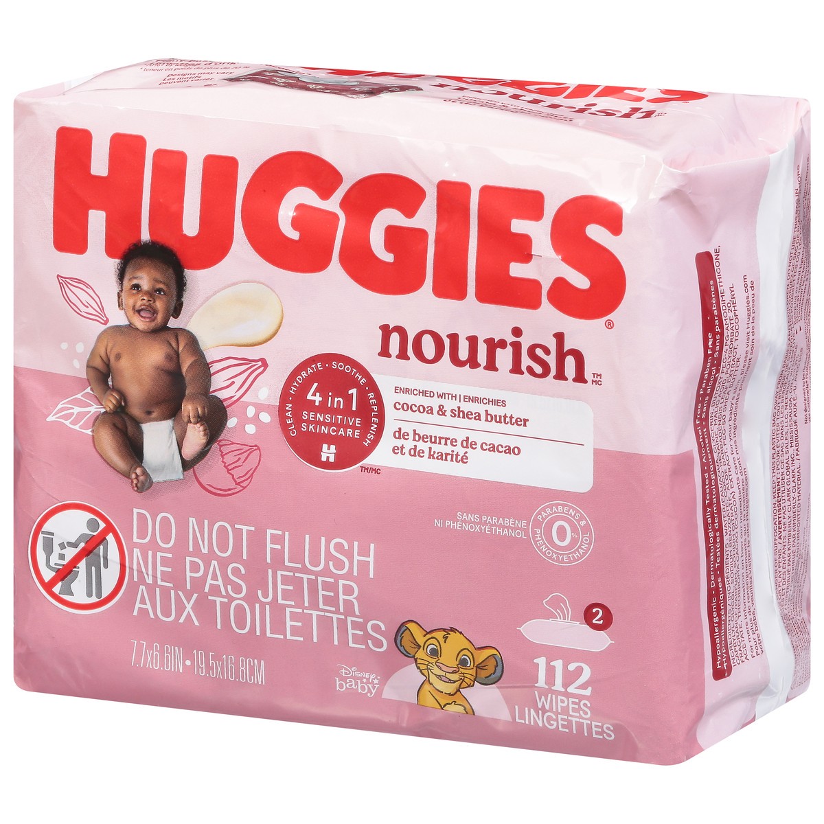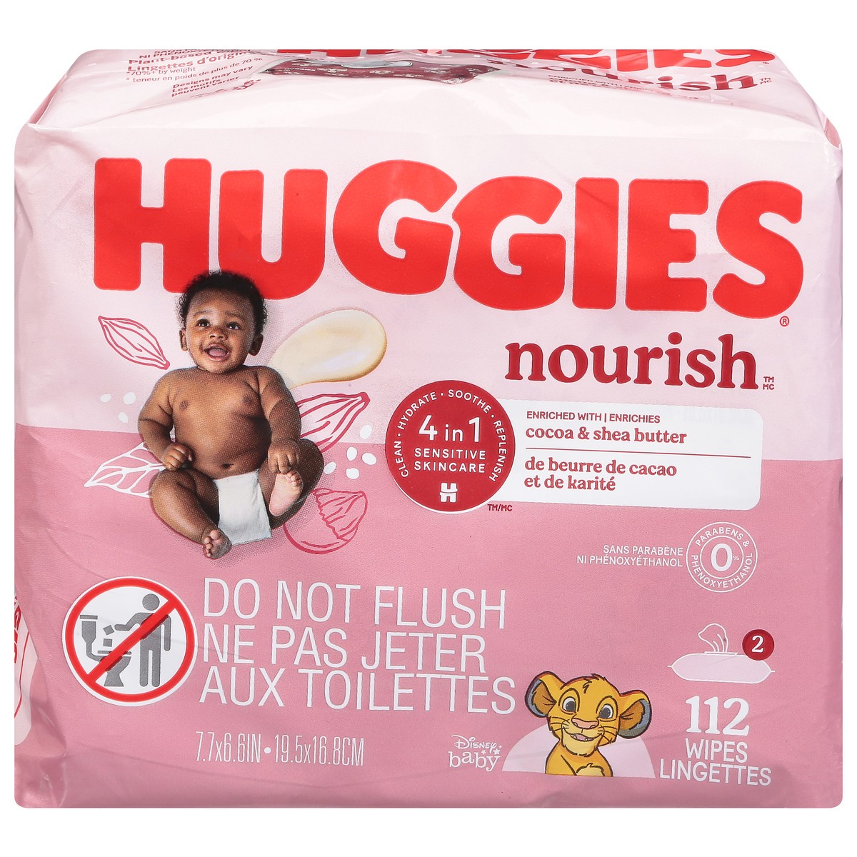 Huggies Nourish Baby Wipes feature 4-in-1 Sensitive Skincare that allows you to clean, hydrate, soothe and replenish your baby's delicate skin. Enriched with cocoa and shea butter, these baby wipes ar…