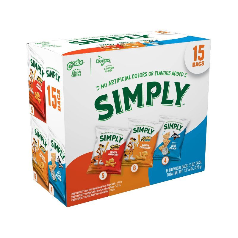 - Frito Lay Simply variety pack includes 15 single serve bags of (5) Simply Cheetos Crunchy White Cheddar, (6) Simpy Cheetos Puffs White Cheddar, (4) Simply Doritos Zesty Cool Ranch.