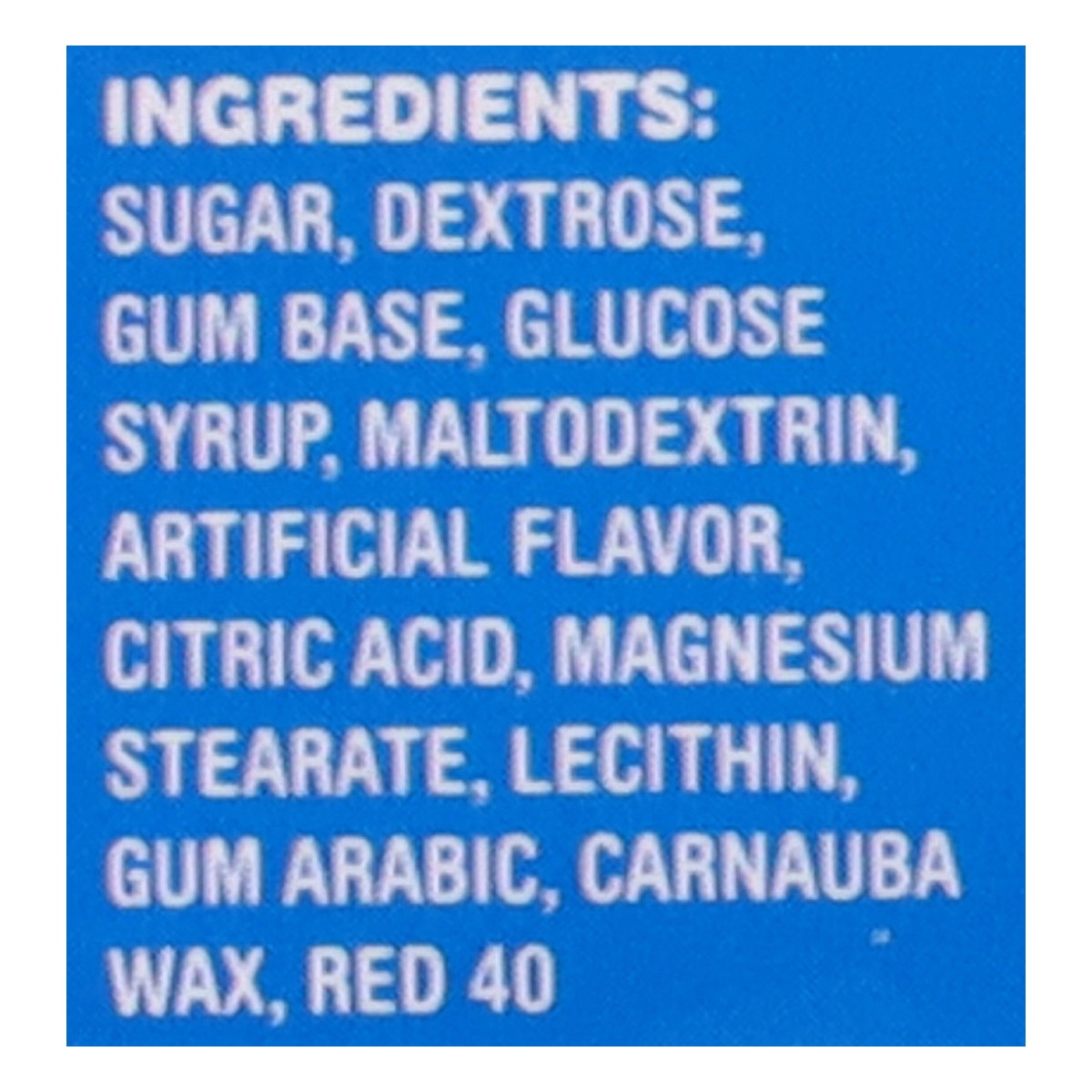 Sugar, Dextrose, Gum Base, Glucose Syrup, Maltodextrin, Artificial Flavor, Citric Acid, Magnesium Stearate, Lecithin, Gum Arabic, Carnauba Wax, Red 40.
