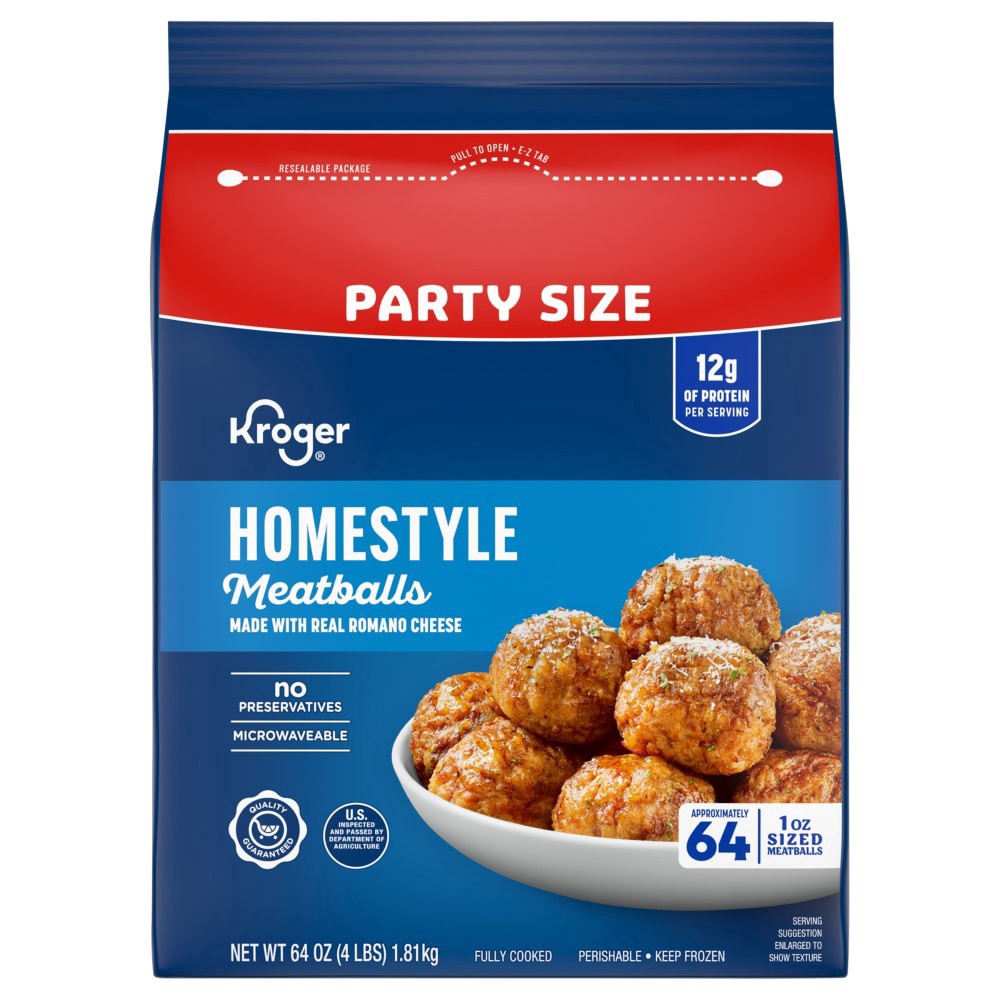 Kroger® Homestyle Meatballs Party Size make dinner a delight! These meaty morsels are made with real Romano cheese, making them super savory. Party size feeds for longer, with approximately 64 1 oz si…