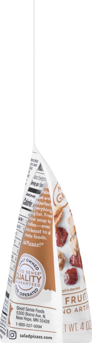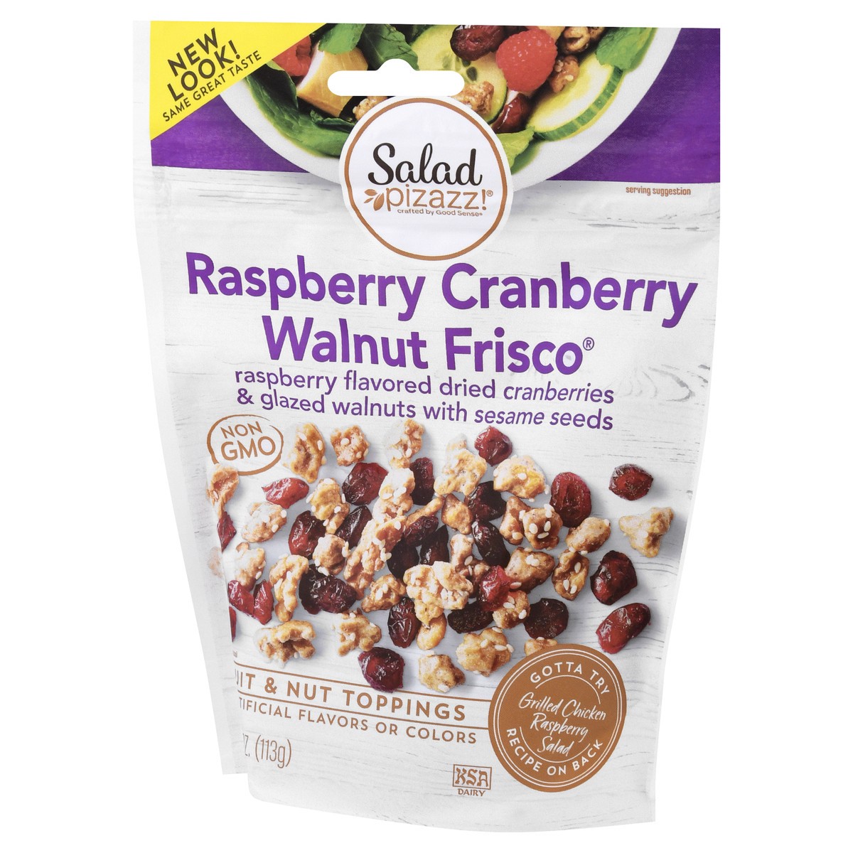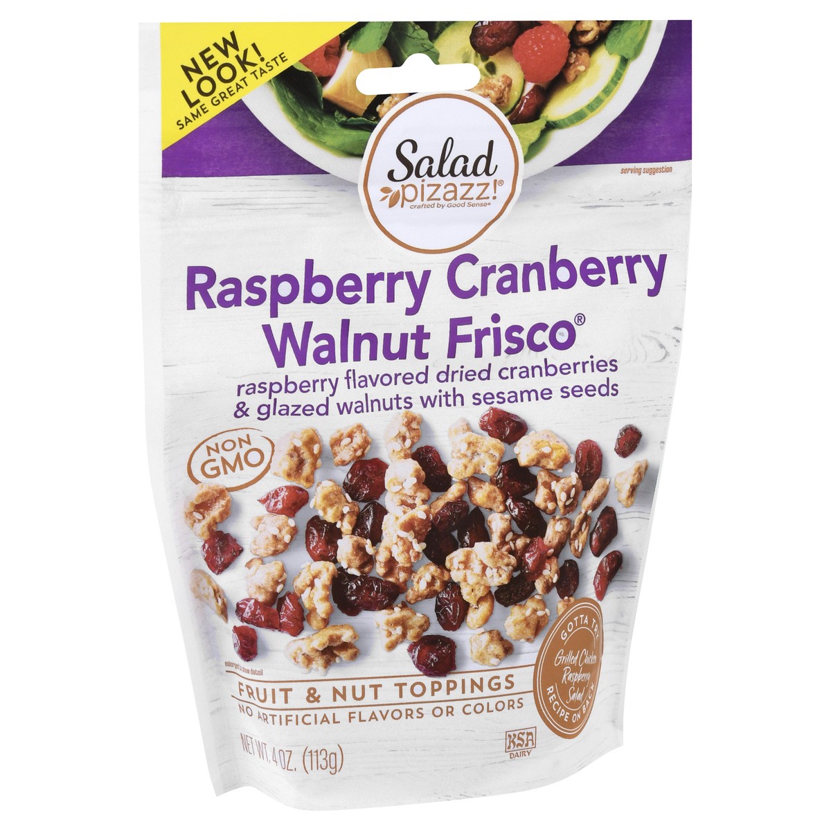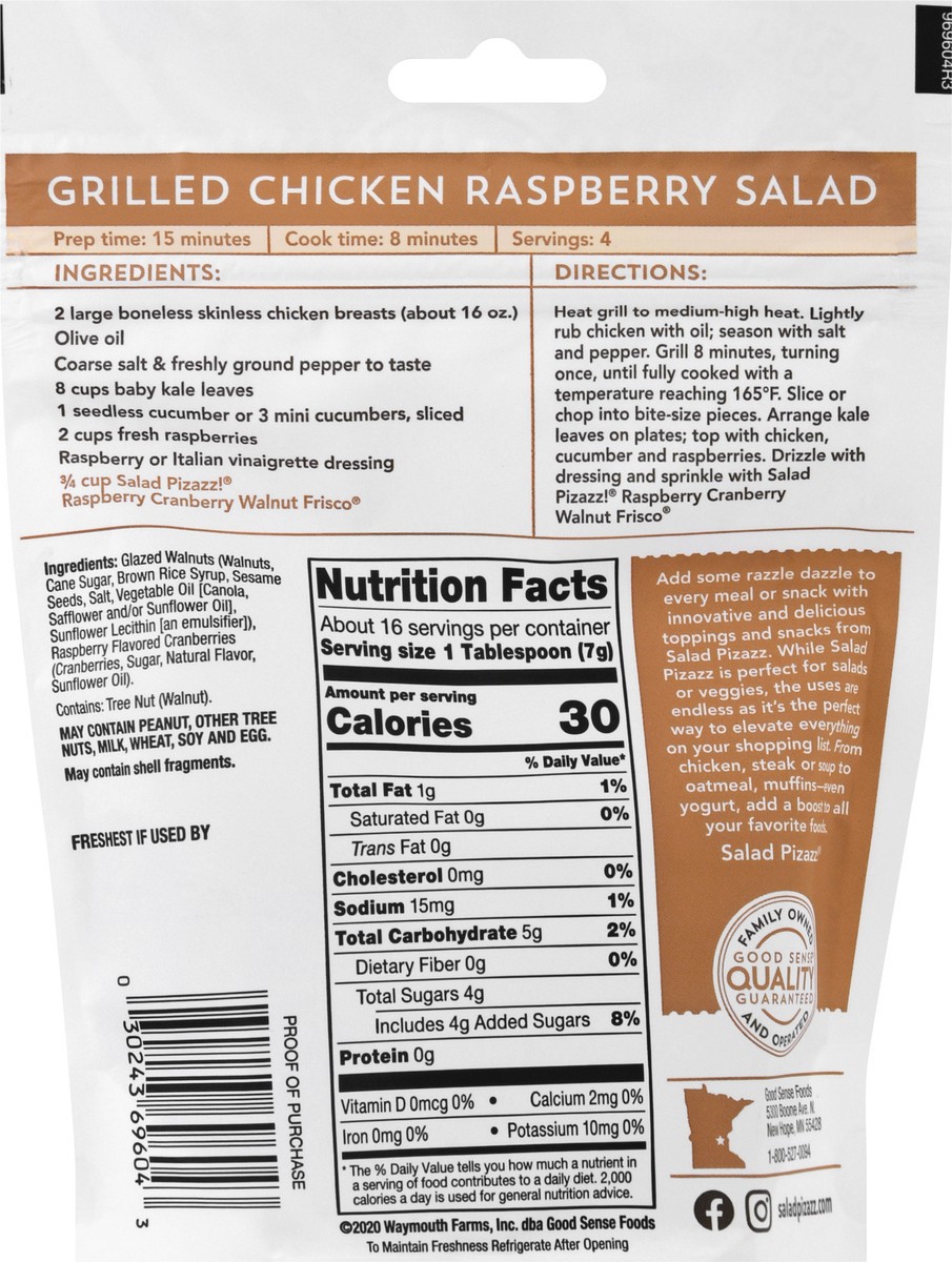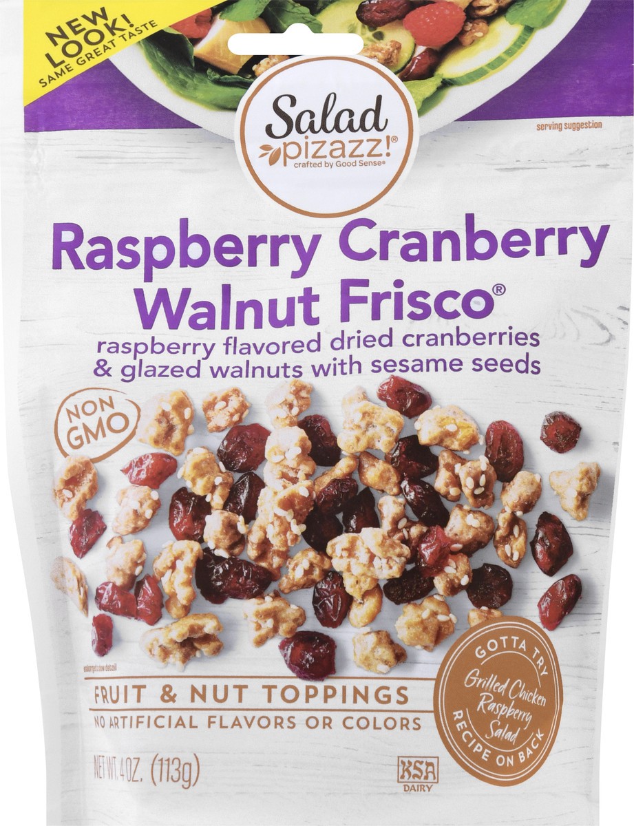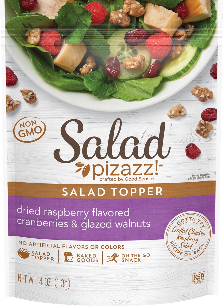 Dried raspberry flavored cranberries & glazed walnuts. No artificial flavors or colors. Non GMO. Crafted by Good Sense. Gotta try Grilled Chicken Raspberry Salad recipe on back. Salad topper. Baked go…