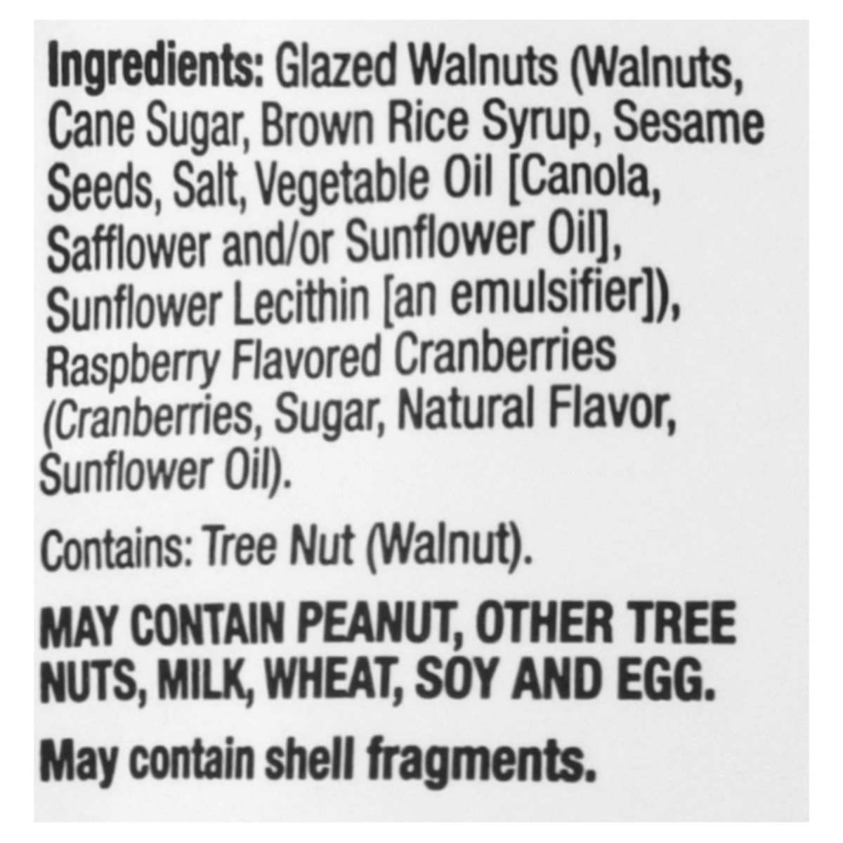 Glazed Walnuts (Walnuts, Cane Sugar, Brown Rice Syrup, Sesame Seeds, Salt, Vegetable Oil [Canola, Safflower and/or Sunflower Oil], Sunflower Lecithin [an Emulsifier]), Raspberry Flavored Cranberries (…