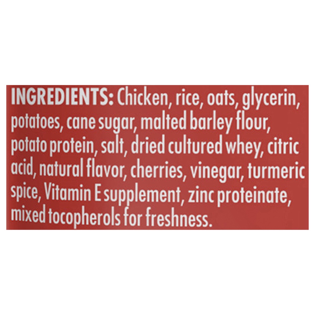 Chicken, Rice, Oats, Glycerin, Potatoes, Cane Sugar, Malted Barley Flour, Potato Protein, Salt, Dried Cultured Whey, Citric Acid, Natural Flavor, Cherries, Vinegar, Turmeric Spice, Vitamin E Supplemen…