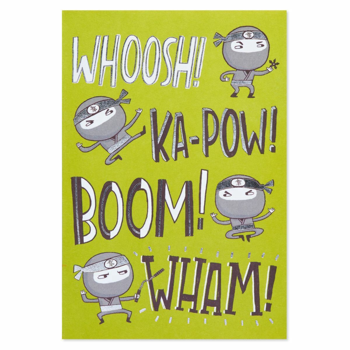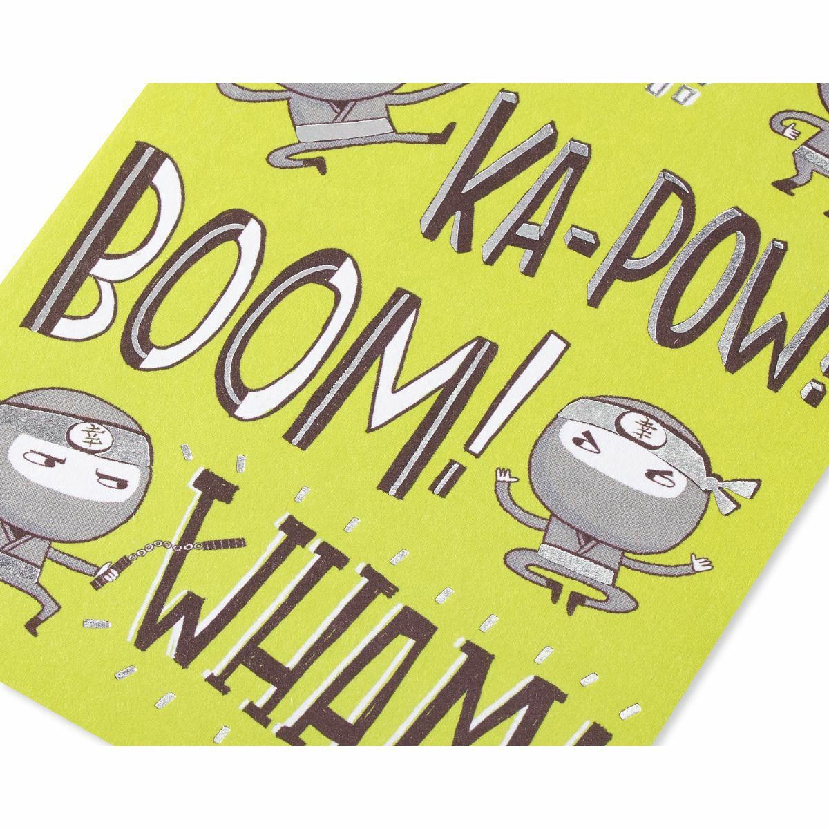 Theres nothing like some ninja action to make a kids birthday extra happy silver foil and hand lettering on a bright green backdrop continue inside as the card opens to reveal a compliment sure to mak…