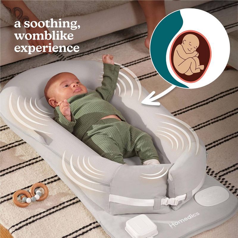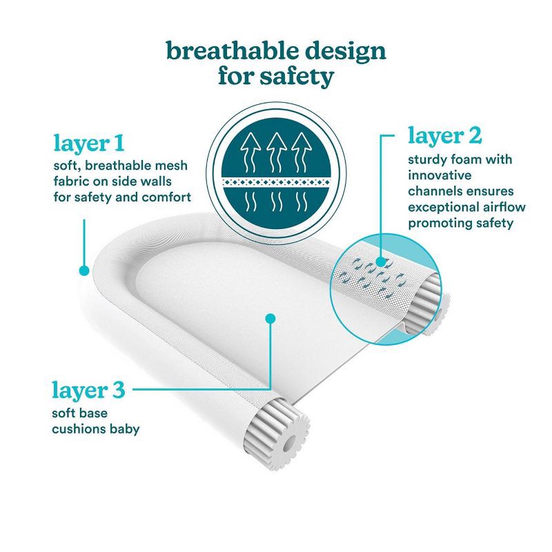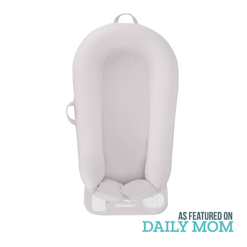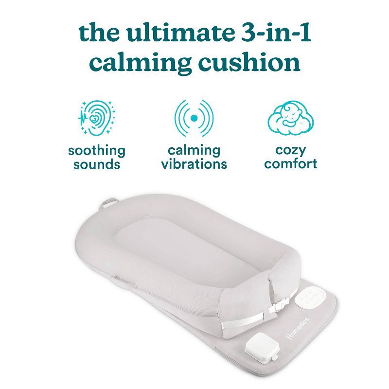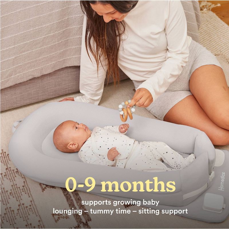 Multifunctional baby lounger/docking station designed for supervised baby soothing, lounging, cuddling, diaper changes, and tummy time. Pillow shape is designed to hug the baby's full body to help cal…