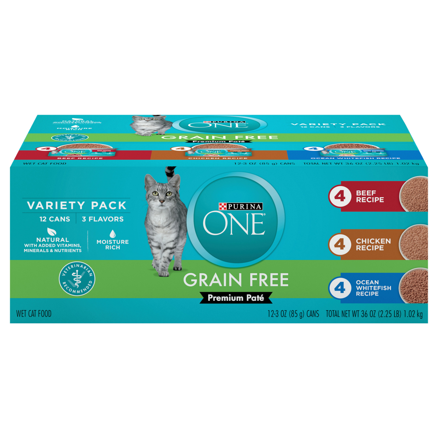 Purina ONE Grain Free, Natural Pate Wet Cat Food Variety Pack, Beef, Chicken and Ocean Whitefish Recipes - (12) 3 oz. Pull-Top Cans