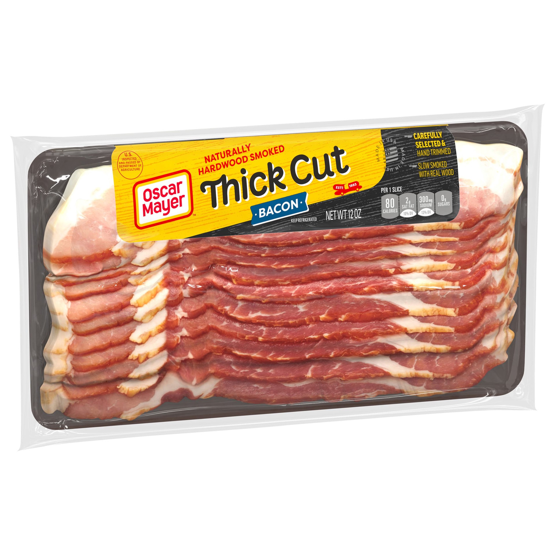Fry up something tasty. Oscar Mayer Naturally Hardwood Smoked Thick Cut Bacon is smoked and hand-trimmed for delicious flavor. Carefully selected cuts of pork are used to make our savory, thick cut ba…