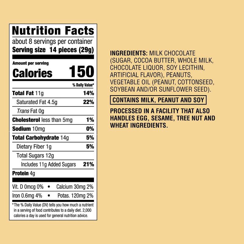 MILK CHOCOLATE (SUGAR, COCOA BUTTER, WHOLE MILK, CHOCOLATE LIQUOR, SOY LECITHIN, ARTIFICIAL FLAVOR), PEANUTS, VEGETABLE OIL (PEANUT, COTTONSEED, SOYBEAN AND/OR SUNFLOWER SEED).