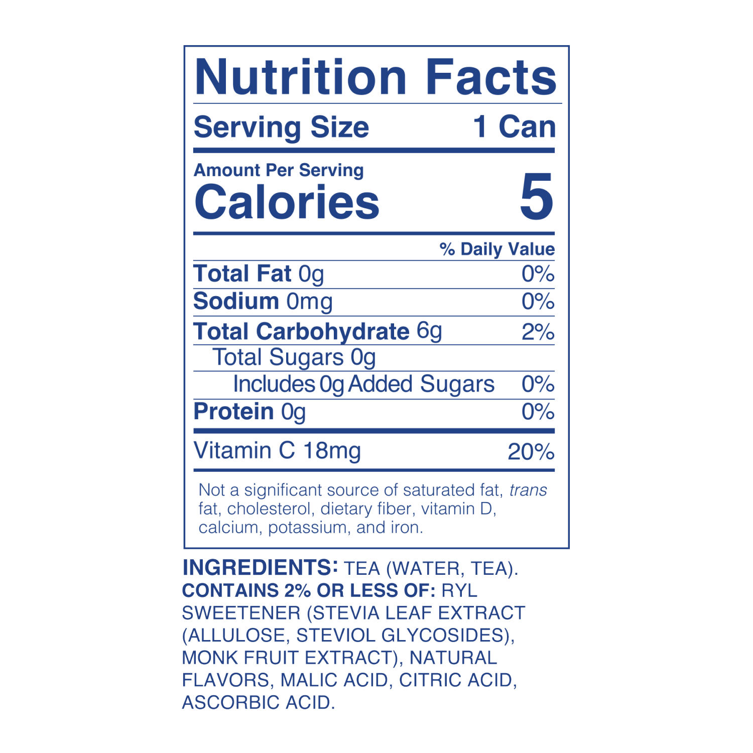 Tea, Stevia Leaf Extract, Monk Fruit, Natural Flavors, Malic Acid, Citric Acid, Ascorbic Acid