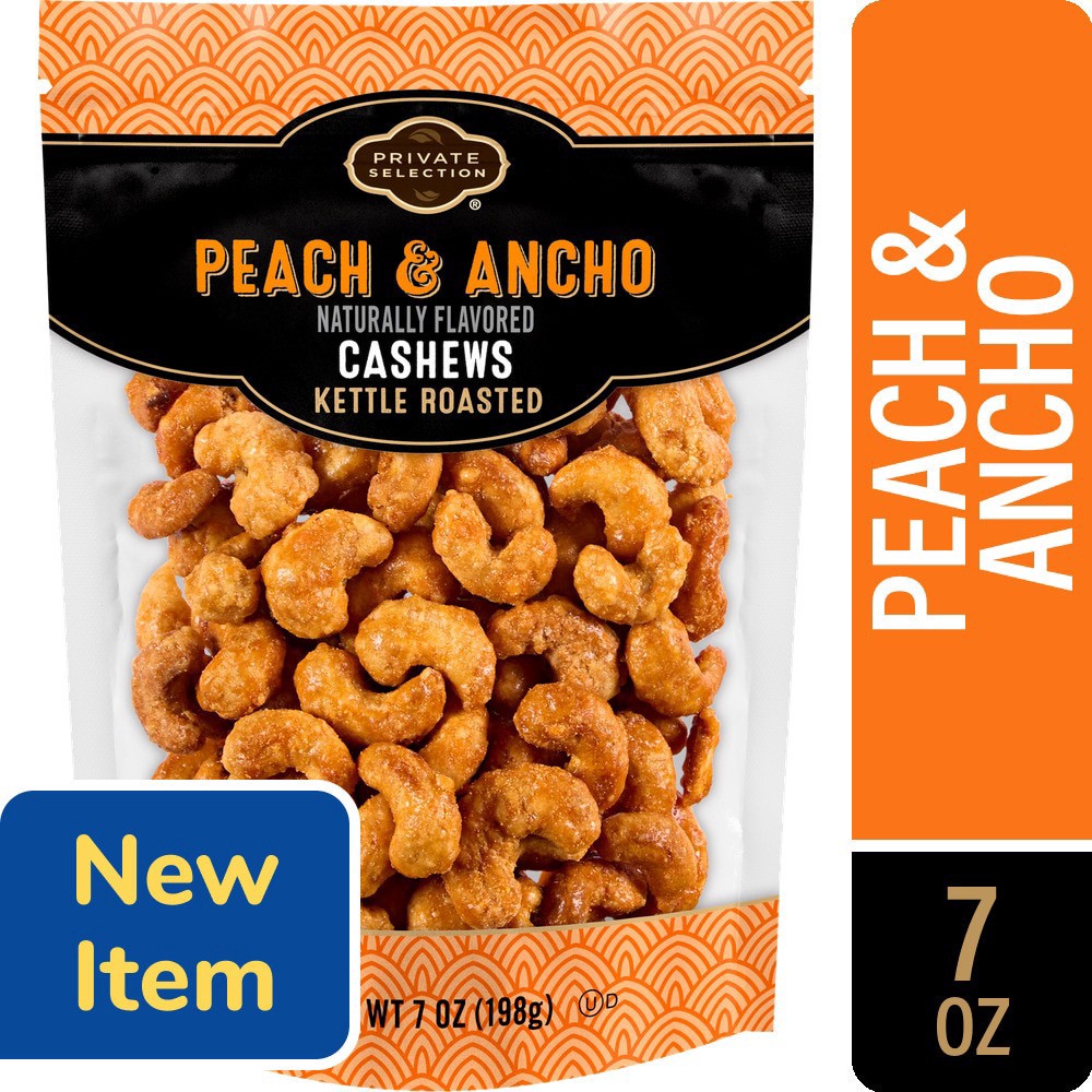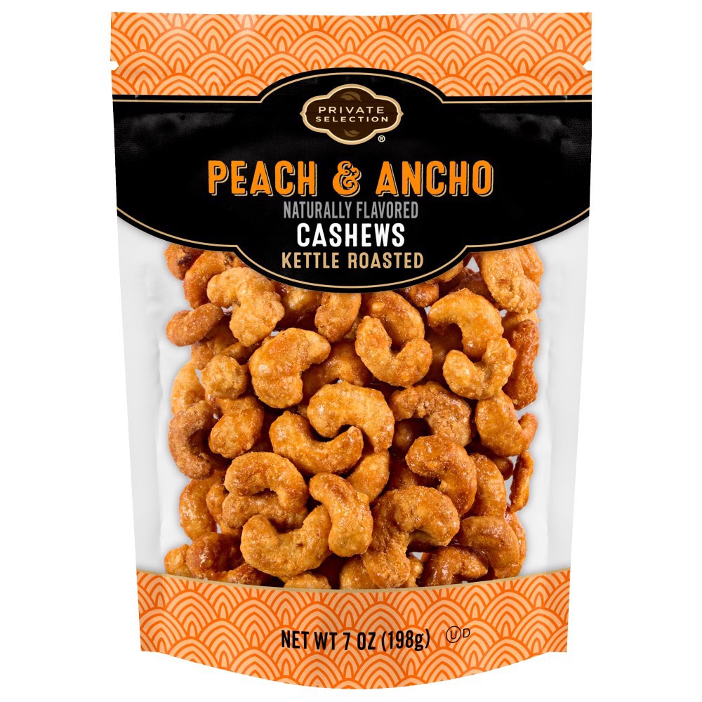 Private Selection® Peach and Ancho Flavored Kettle Roasted Cashews are a delectable snacking treat perfect for any pantry. These nuts are a cashew-lover's dream with natural peach and ancho flavors. T…