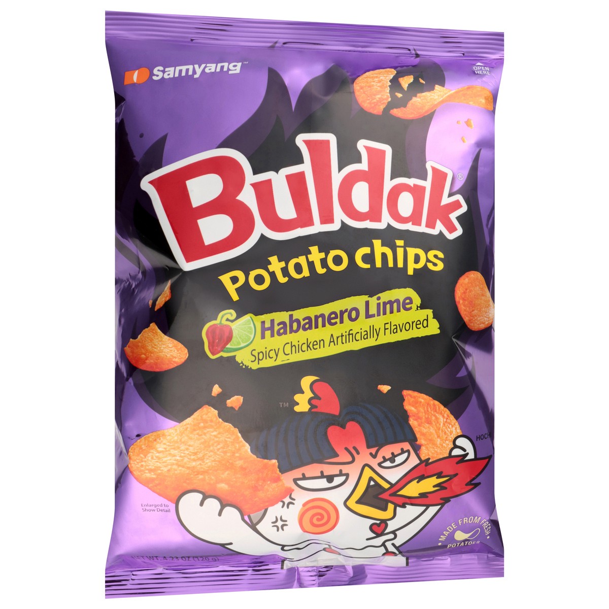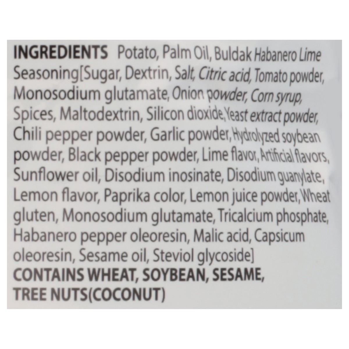 Potato, Palm Oil, Buldak Habanero Lime Seasoning [Sugar, Dextrin, Salt, Citric Acid, Tomato Powder, Monosodium Glutamate, Onion Powder, Corn Syrup, Spices, Maltodextrin, Silicon Dioxide, Yeast Extract…