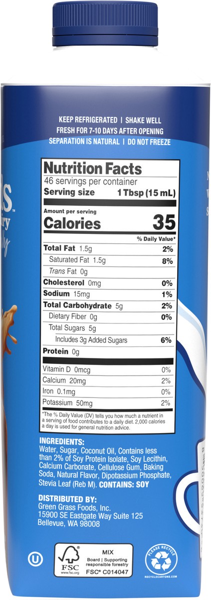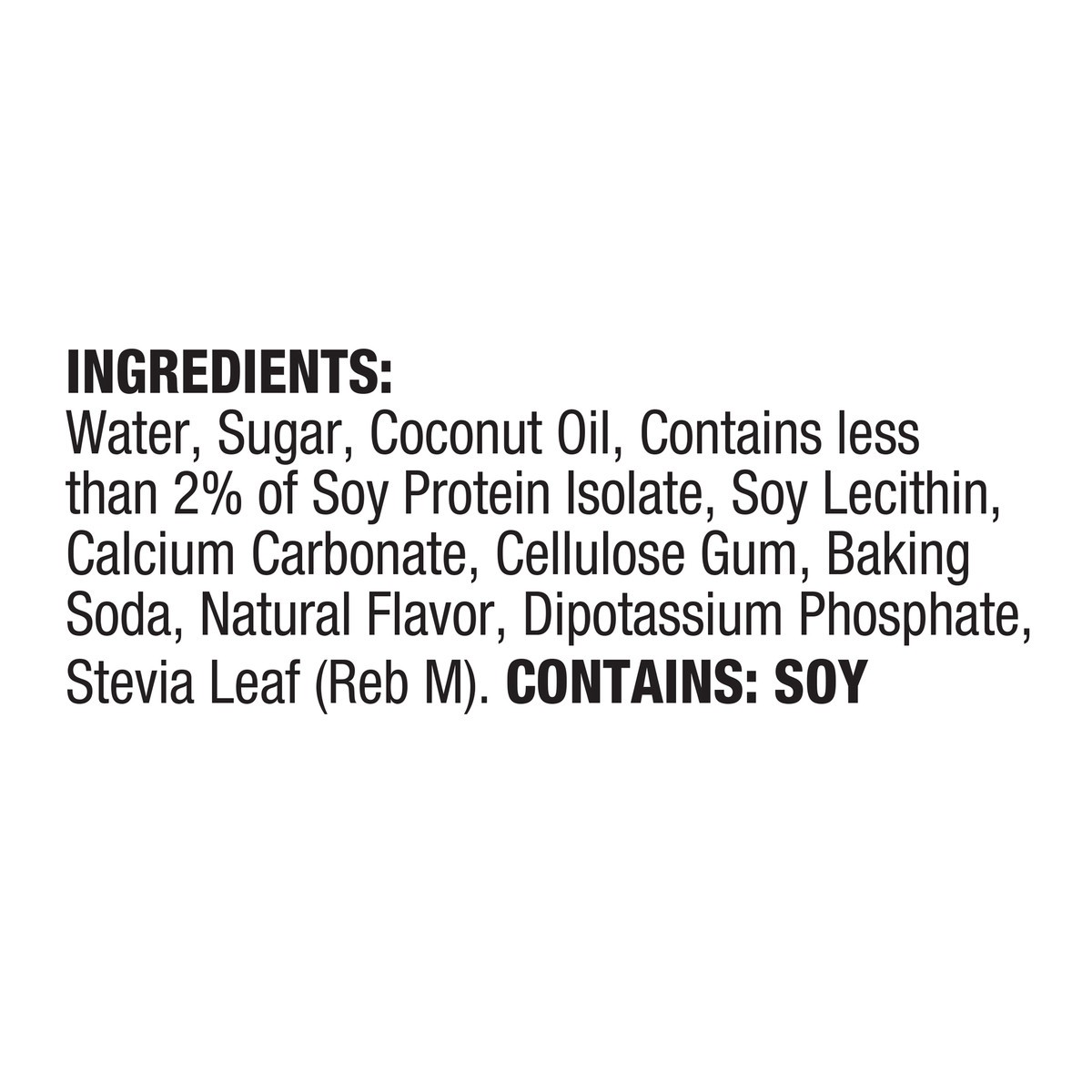 Water, Sugar, Coconut Oil, Contains Less than 2% of Soy Protein Isolate, Soy Lecithin, Calcium Carbonate, Cellulose Gum, Baking Soda, Natural Flavor, Dipotassium Phosphate, Stevia Leaf (Reb M).