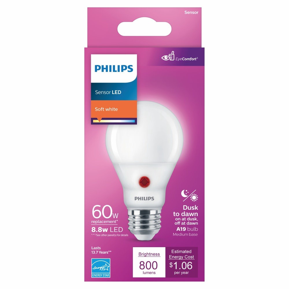Philips Dusk to Dawn, 60-watt replacement A19 LED light bulb offers both savings and security. A built-in sensor automatically illuminates the bulb at dusk and turns it off at dawn to help save energy…