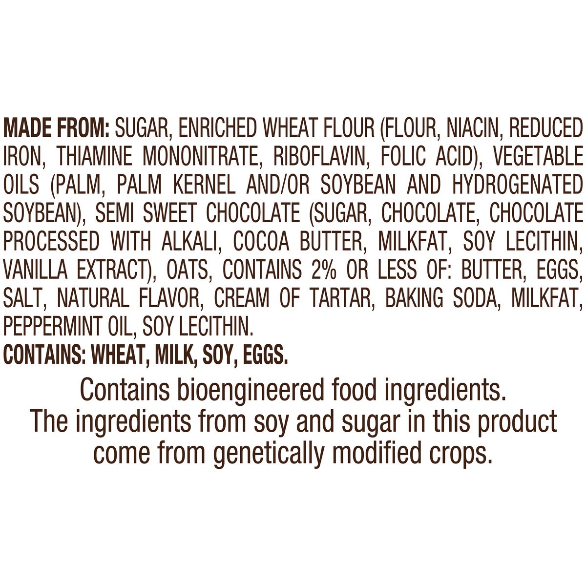 MADE FROM: SUGAR, ENRICHED WHEAT FLOUR (FLOUR, NIACIN, REDUCED IRON, THIAMINE MONONITRATE, RIBOFLAVIN, FOLIC ACID), VEGETABLE OILS (PALM, PALM KERNEL AND/OR SOYBEAN AND HYDROGENATED SOYBEAN), SEMI SWE…