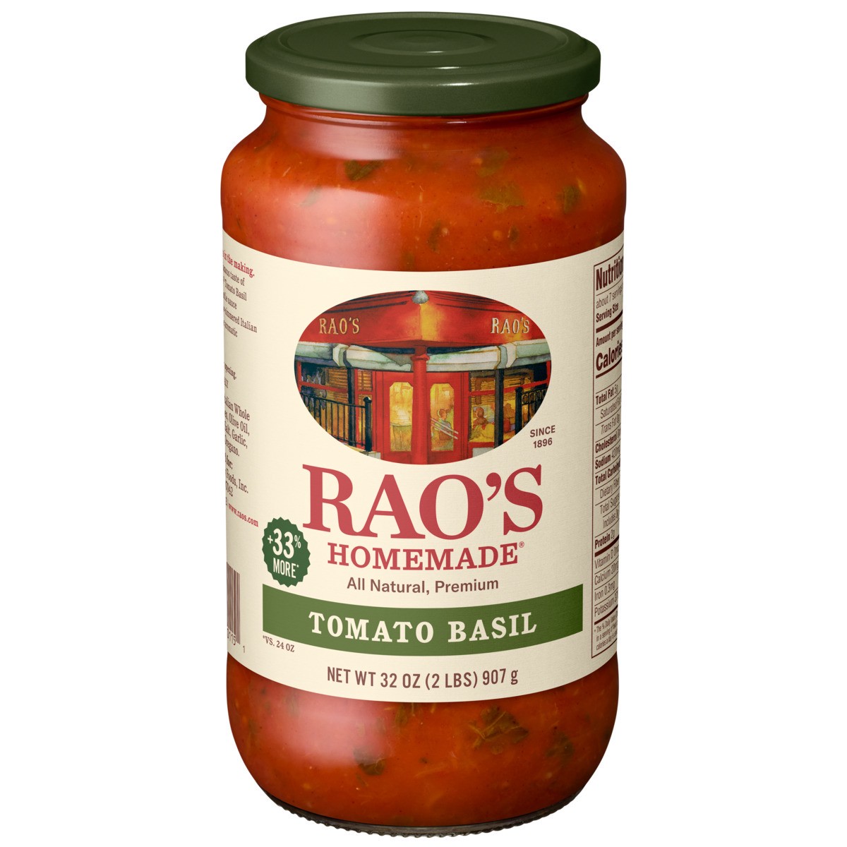 - With 33% more than our 24 oz jar, this Rao’s Homemade Tomato Basil Sauce is made with whole‑peeled Italian tomatoes and flavorful herbs like oregano and basil