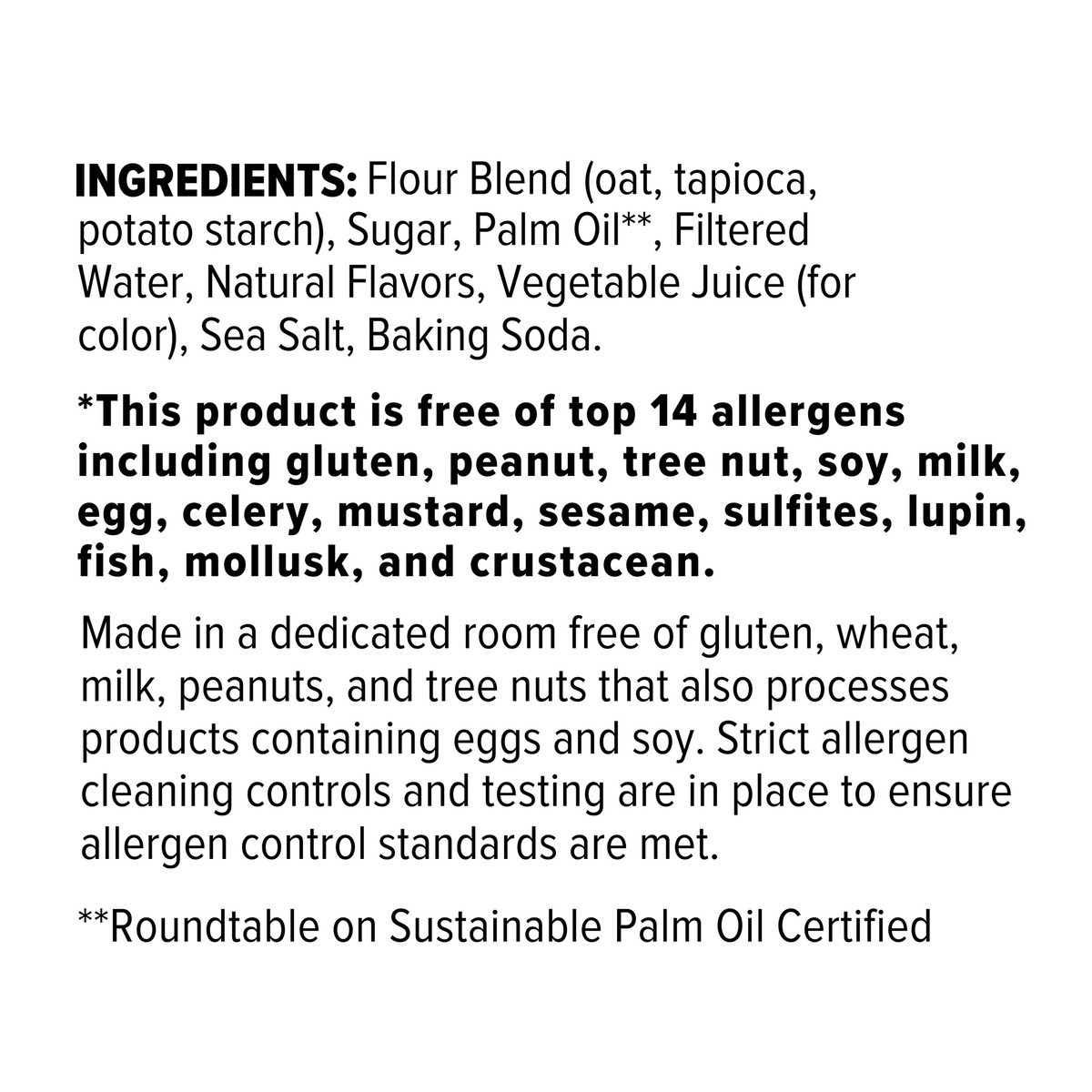 Flour Blend (Oat, Tapioca, Potato Starch), Sugar, Palm Oil**, Filtered Water, Natural Flavors, Vegetable Juice (for Color), Sea Salt, Baking Soda. ** Roundtable on Sustainable Palm Oil Certified.