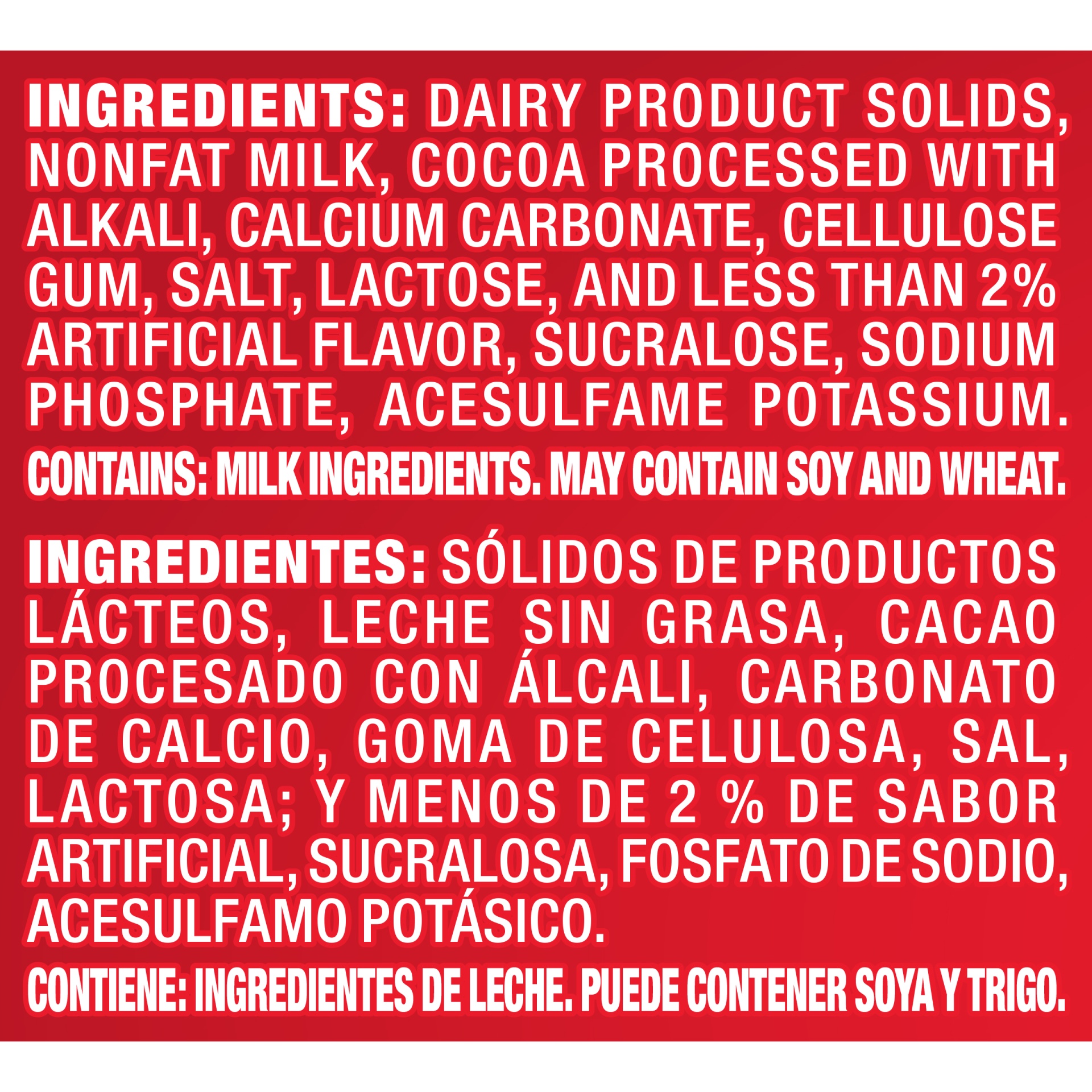 Dairy Product Solids, Nonfat Milk, Cocoa Processed with Alkali, Calcium Carbonate, Cellulose Gum, Salt, Lactose, and Less than 2% of Artificial Flavor, Sucralose, Sodium Phosphate, Acesulfame Potassiu…