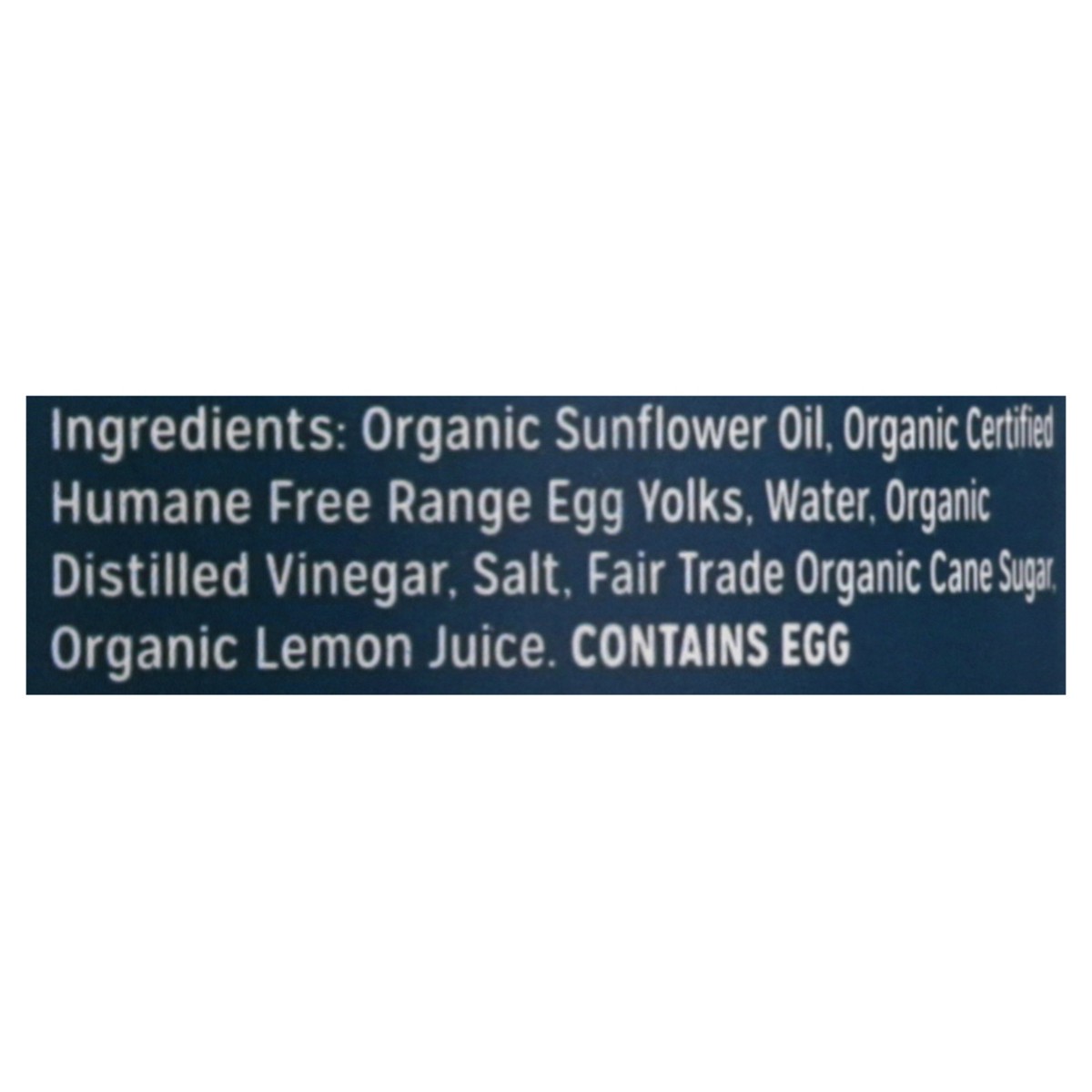 Organic Sunflower Oil, Organic Certified Humane Cage Free Egg Yolks, Water, Organic Distilled Vinegar, Salt, Fair Trade Organic Cane Sugar, Organic Lemon Juice.