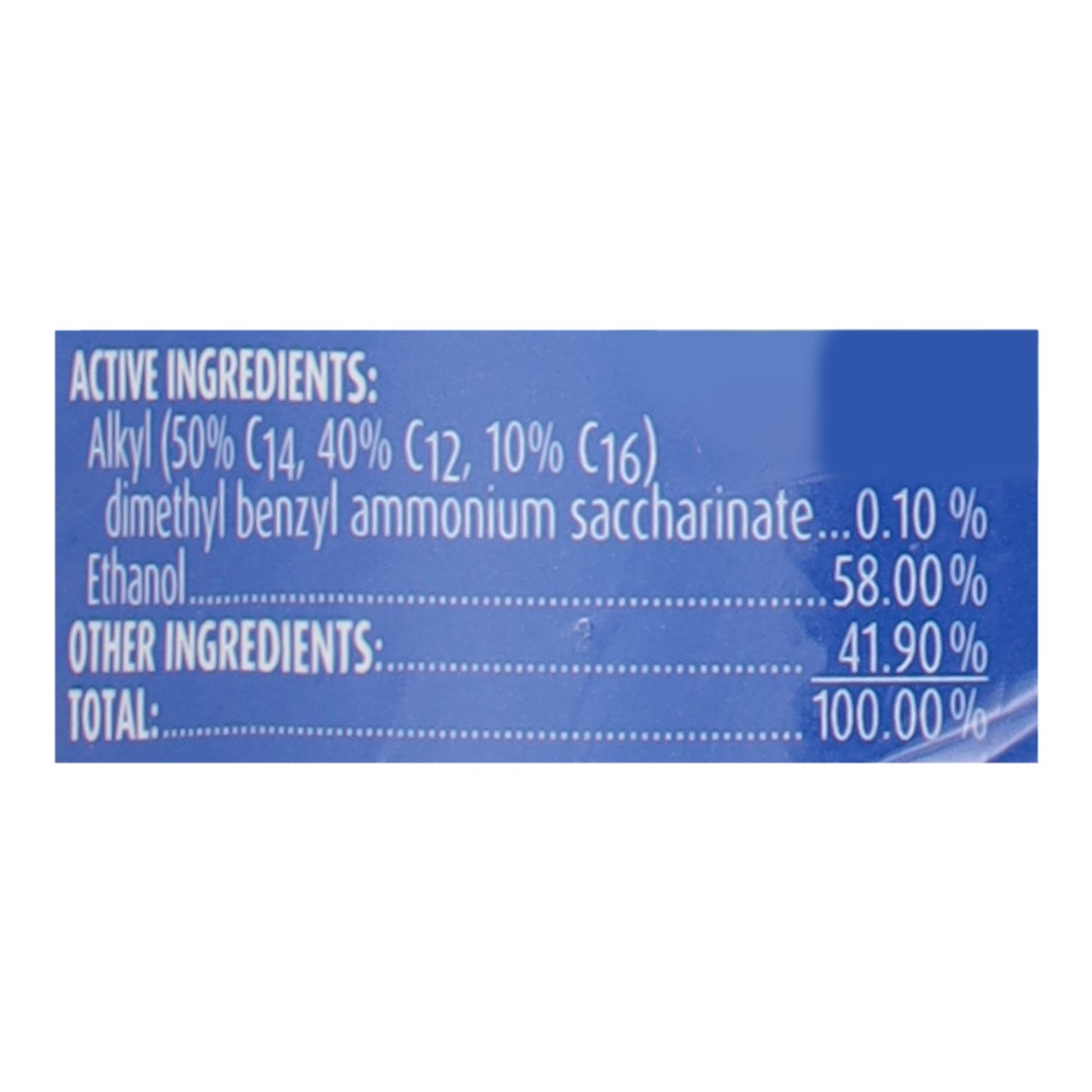 Active Ingredient: Alkyl (50% C14, 40% C12, 10% C16) Dimethyl Benzyl Ammonium Saccharinate - 0.10%; Ethanol - 58.00%; Other Ingredients - 41.90%; Total - 100.00%.